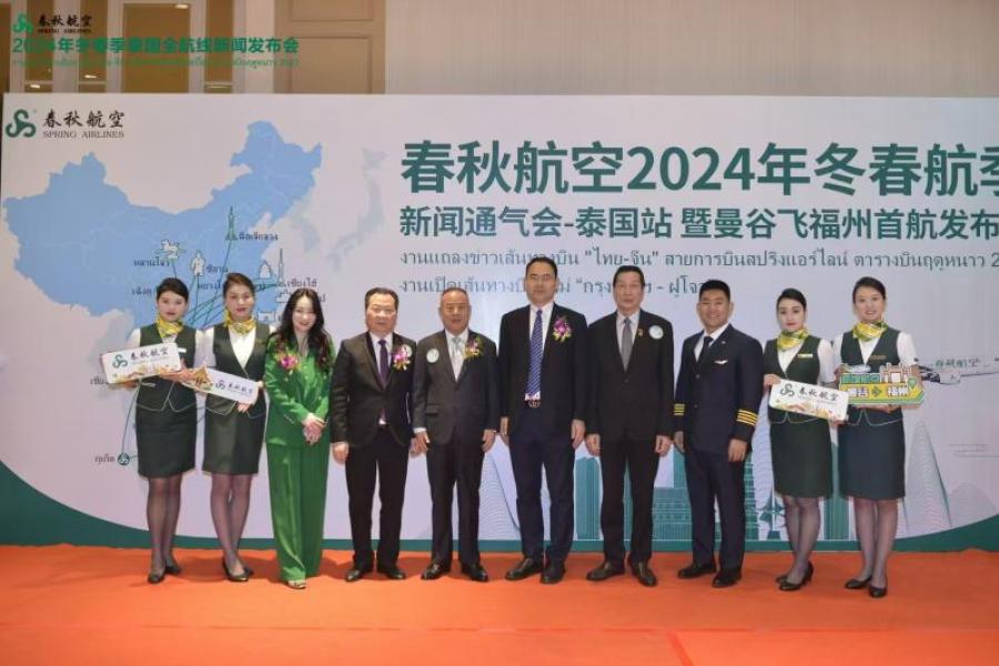 งานเปิดเส้นทางบินใหม่ “กรุงเทพฯ – ฝูโจว” ได้จัดขึ้นที่กรุงเทพมหานคร ประเทศไทย โดยผู้เข้าร่วมงานแถลงข่าวได้แก่ Mr. Zhang Wuan รองประธานและโฆษก สายการบินสปริงแอร์ไลน์ Miss Yu Jiali ผู้จัดการทั่วไป ภูมิภาคเอเชียตะวันออกเฉียงใต้ สายการบินสปริงแอร์ไลน์ คุณบุญยงค์ ยงเจริญรัฐ รองประธานหอการค้าไทย-จีน Miss Zhao Xin รองผู้อํานวยการสํานักงานการท่องเที่ยวแห่งประเทศจีน ณ กรุงเทพฯ ดร. กีรติ กิจมานะวัฒน์ กรรมการผู้อำนวยการใหญ่ บริษัท ท่าอากาศยานไทย จำกัด (มหาชน) Mrs. Chen Hua ประธานสมาคมการค้าวิสาหกิจจีน ประธานคณะผู้ประกอบการหอการค้าวิสาหกิจจีนในประเทศไทย ประธานกลุ่มชาวจีนโพ้นทะเล ตัวแทนอุตสาหกรรมเกี่ยวข้องกับการท่องเที่ยวในประเทศไทย