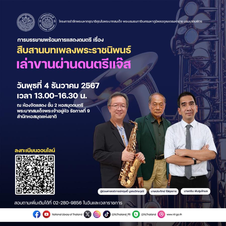 กรมศิลปากร ขอเชิญรับฟังการบรรยายพร้อมการแสดงดนตรี เรื่อง “สืบสานบทเพลงพระราชนิพนธ์ เล่าขานผ่านดนตรีแจ๊ส” ในวันพุธที่ 4 ธันวาคม 2567 เวลา 13.00 - 16.30 น. ณ ห้องจัดแสดง ชั้น 2 หอสมุดดนตรีพระบาทสมเด็จพระเจ้าอยู่หัว รัชกาลที่ 9 สำนักหอสมุดแห่งชาติ เพื่อรำลึกถึงพระมหากรุณาธิคุณและเผยแพร่พระอัจฉริยภาพทางด้านดนตรีในพระบาทสมเด็จพระบรมชนกาธิเบศร มหาภูมิพลอดุลยเดชมหาราช บรมนาถบพิตร