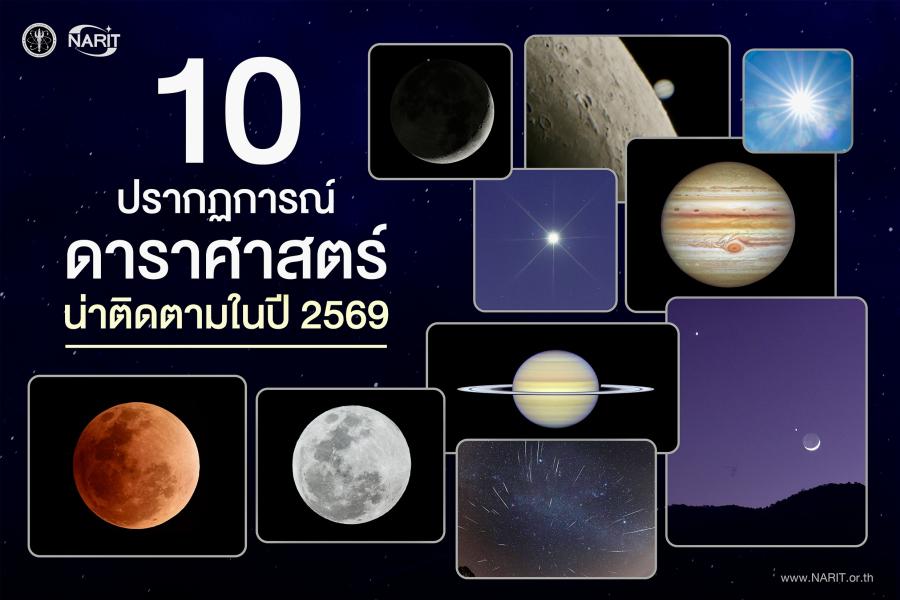 สถาบันวิจัยดาราศาสตร์แห่งชาติ (องค์การมหาชน) (สดร. หรือ NARIT) กระทรวงการอุดมศึกษา วิทยาศาสตร์ วิจัย และนวัตกรรม (อว.) เปิดโผ 10 ปรากฏการณ์ดาราศาสตร์น่าติดตามปี 2569 ประเดิมเปิดศักราชใหม่กับ “ดาวพฤหัสบดีใกล้โลก” ในวันเด็กแห่งชาติ และตามมาอีกหลายปรากฏการณ์เด่นทั้งจันทรุปราคาเต็มดวง ดวงจันทร์ใกล้-ไกลโลก ดวงจันทร์บังดาวศุกร์ ดาวศุกร์สว่างที่สุด ดาวเสาร์ใกล้โลก ดวงจันทร์บังดาวพฤหัสบดี ดวงอาทิตย์ตั้งฉาก รวมถึงฝนดาวตก และดาวเคียงเดือนมีให้ติดตามชมได้ตลอดปี