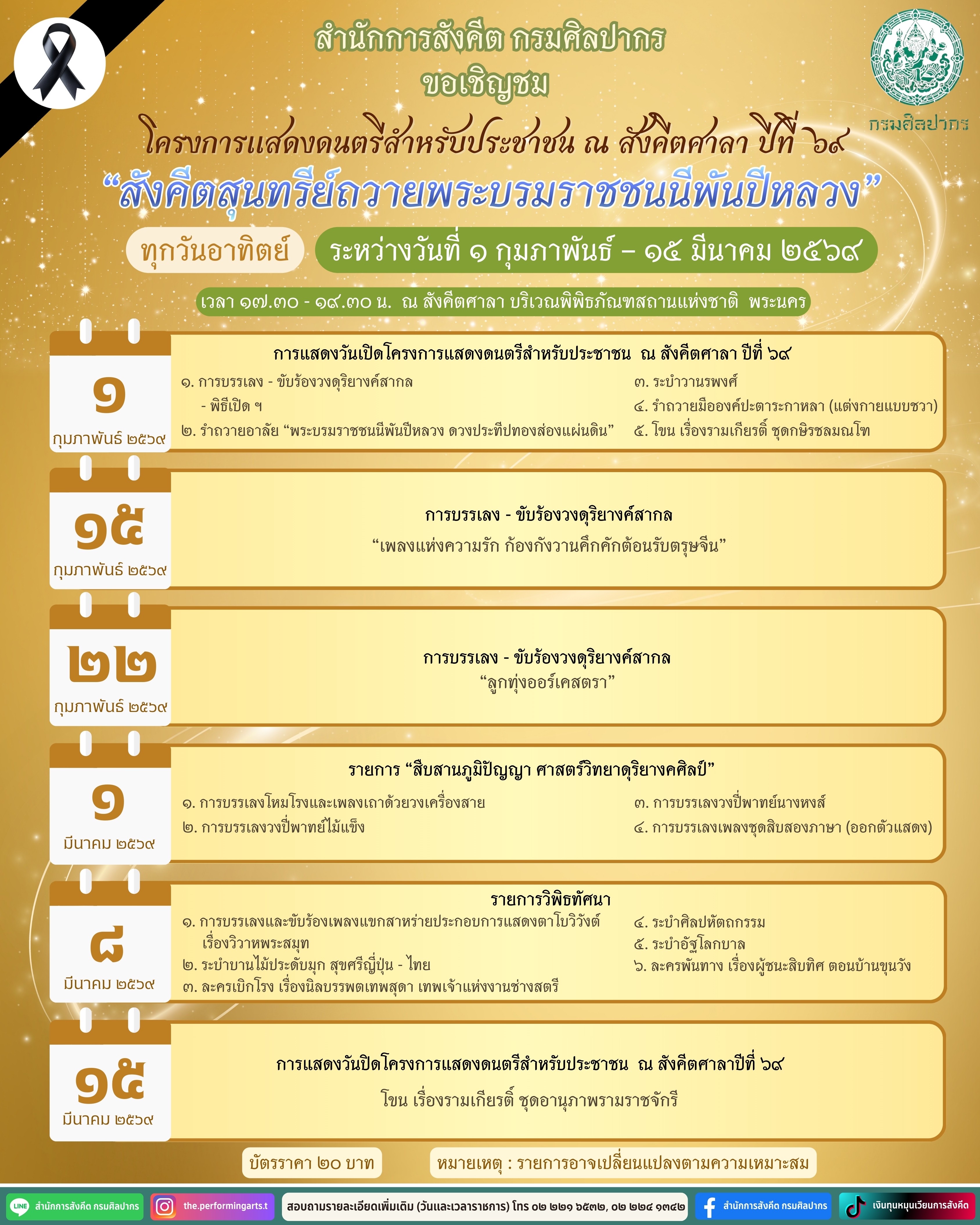 ขอเชิญชวนผู้สนใจชมการแสดงโครงการดนตรีสำหรับประชาชน ปีที่ 69 “สังคีตสุนทรีย์ถวายพระบรมราชชนนีพันปีหลวง” ทุกวันอาทิตย์ ระหว่างวันอาทิตย์ที่ 1 กุมภาพันธ์ 2569 ถึงวันอาทิตย์ที่ 15 มีนาคม 2569 และการแสดงสมโภชพระพุทธสิหิงค์ ในวันจันทร์ที่ 2 กุมภาพันธ์ 2569 เวลา 17.30 น. ณ เวทีสังคีตศาลา บริเวณพิพิธภัณฑสถานแห่งชาติ พระนคร ติดตามรายละเอียดได้ทางเว็บไซต์กรมศิลปากร www.finearts.go.th