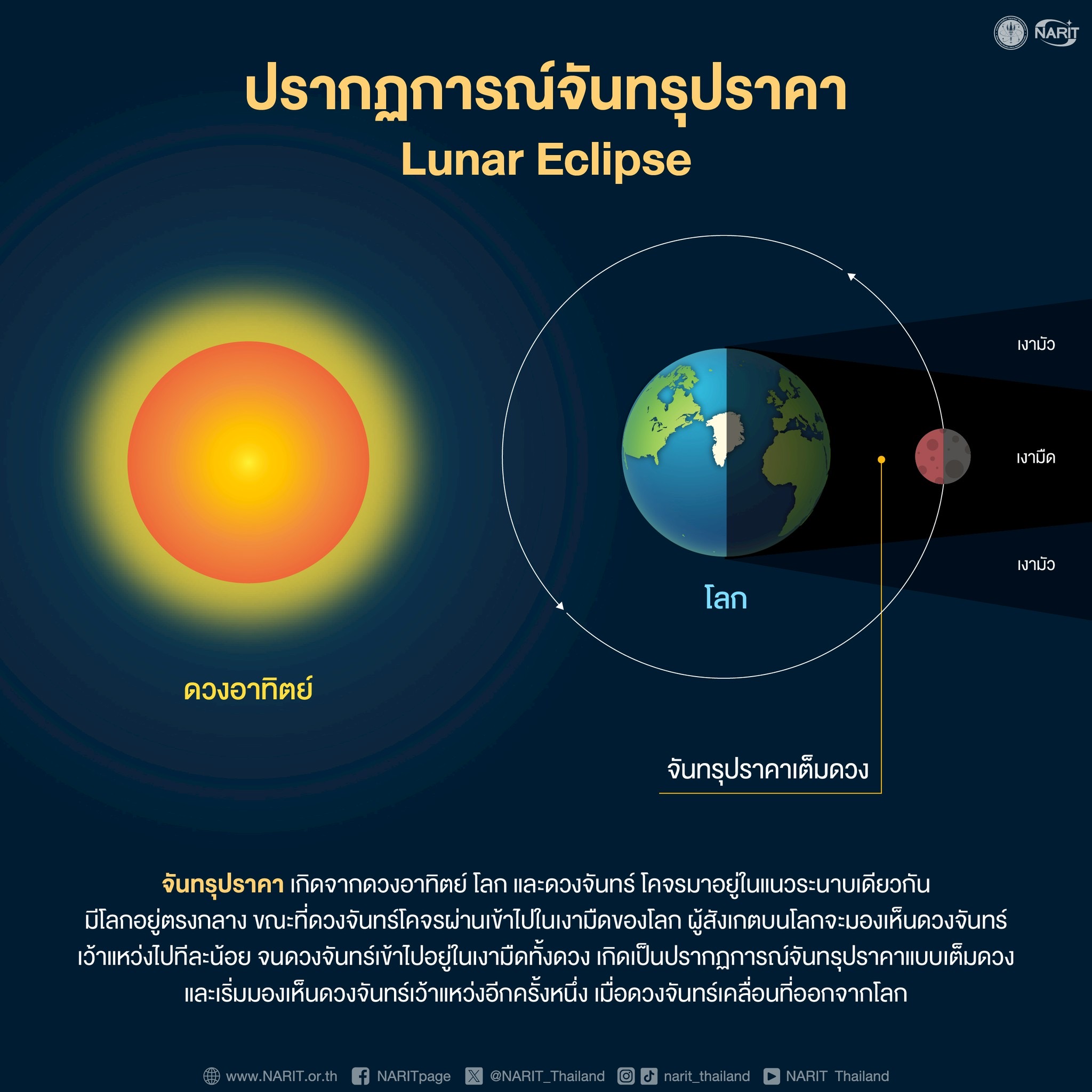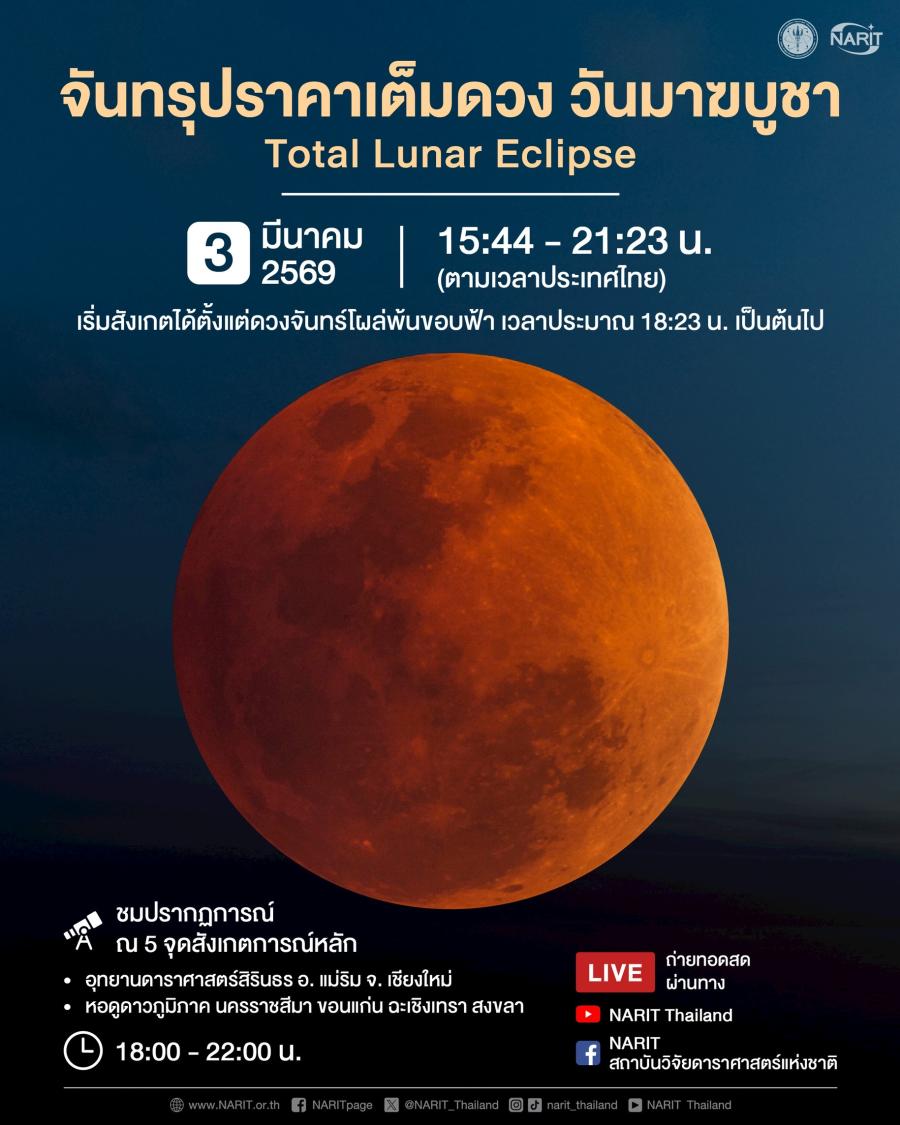 สถาบันวิจัยดาราศาสตร์แห่งชาติ (องค์การมหาชน) (สดร.) หรือ NARIT กระทรวงการอุดมศึกษา วิทยาศาสตร์ วิจัย และนวัตกรรม (อว.) เผยวันที่ 3 มีนาคม 2569 ตรงกับวันมาฆบูชา จะเกิดปรากฏการณ์ “จันทรุปราคาเต็มดวง” เวลาประมาณ 15:44 - 21:23 น. (ตามเวลาประเทศไทย ณ กรุงเทพมหานคร) ในไทยเริ่มสังเกตได้ด้วยตาเปล่าตั้งแต่ดวงจันทร์โผล่พ้นขอบฟ้า เวลาประมาณ 18:23 น. เป็นต้นไป ตรงช่วงคราสเต็มดวงพอดี ดวงจันทร์เต็มดวงจะปรากฏเป็นสีแดงอิฐ จนถึงเวลาประมาณ 19:02 น. นาน 39 นาที หลังจากนั้นก็ยังติดตามชมได้จนสิ้นสุดปรากฏการณ์