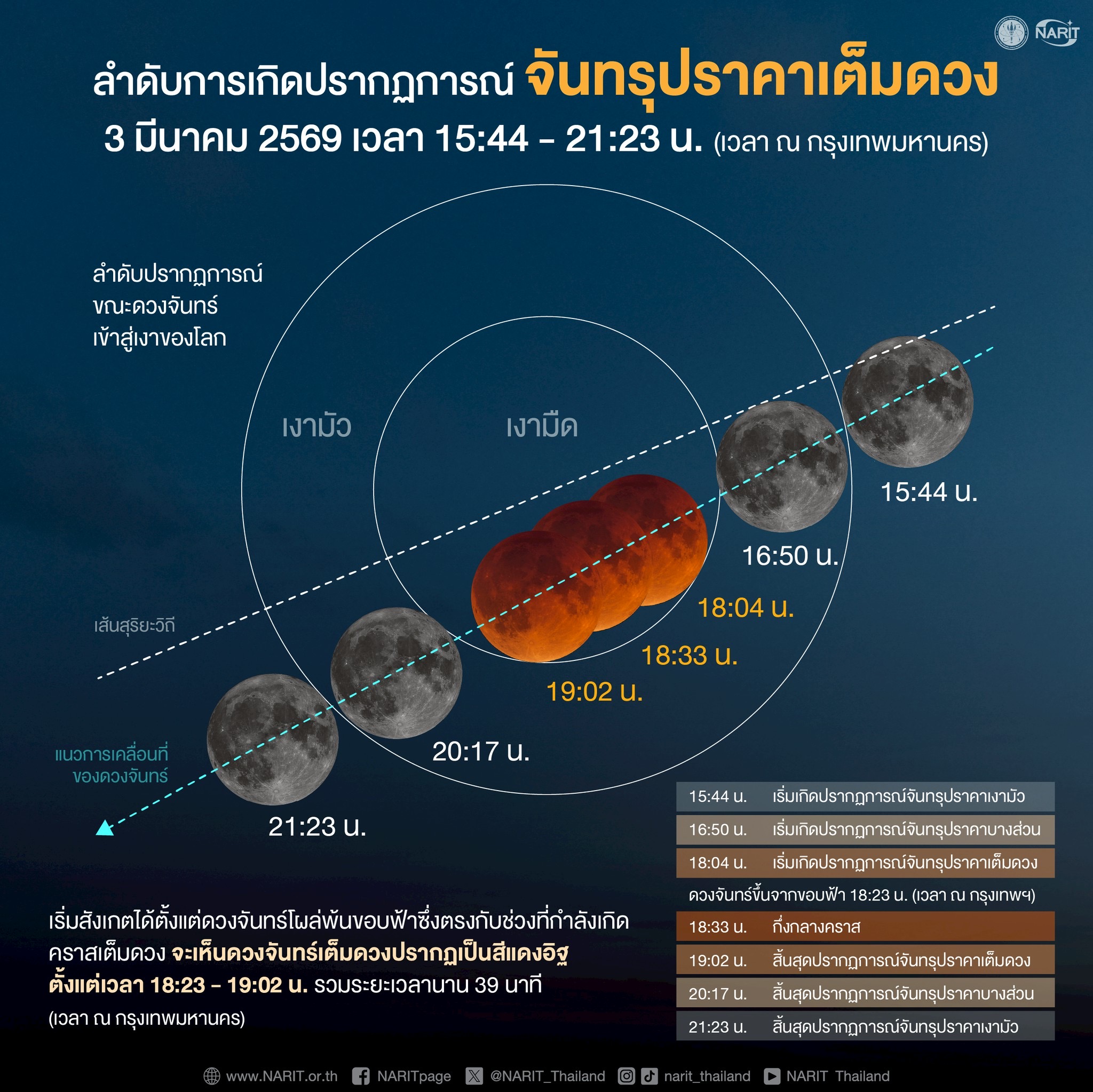 นายศุภฤกษ์ คฤหานนท์ ผู้ช่วยผู้อำนวยการสถาบันวิจัยดาราศาสตร์แห่งชาติ เปิดเผยว่า วันที่ 3 มีนาคม 2569 จะเกิดปรากฏการณ์จันทรุปราคาซึ่งตรงกับวันมาฆบูชา ตั้งแต่เวลาประมาณ 15:44 - 21:23 น. (ตามเวลาประเทศไทย ณ กรุงเทพมหานคร) โดยดวงจันทร์จะเริ่มเข้าสู่เงามัวของโลกเวลา 15:44 น. และเคลื่อนเข้าสู่เงามืดของโลก เกิดเป็นจันทรุปราคาบางส่วนในเวลา 16:50 น. จนกระทั่งเข้าสู่ช่วง “จันทรุปราคาเต็มดวง” เวลา 18:04 - 19:02 น. จากนั้นเริ่มเห็นดวงจันทร์ปรากฏเว้าแหว่งบางส่วนและค่อย ๆ ออกจากเงามืดของโลก และสิ้นสุดปรากฏการณ์จันทรุปราคาบางส่วน ในเวลา 20:17 น. และพ้นจากเงามัวของโลก จนสิ้นสุดปรากฏการณ์เวลา 21:23 น.