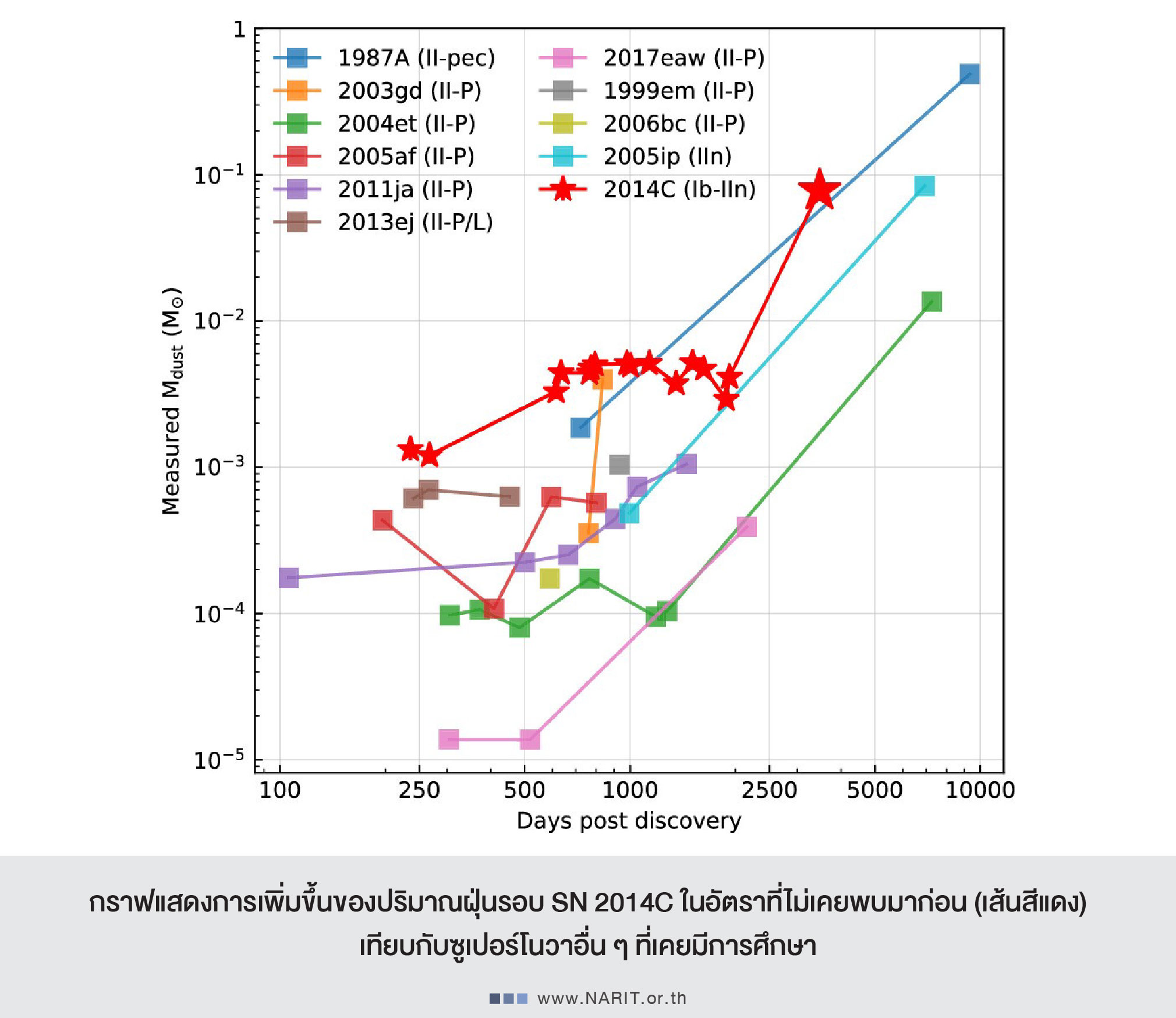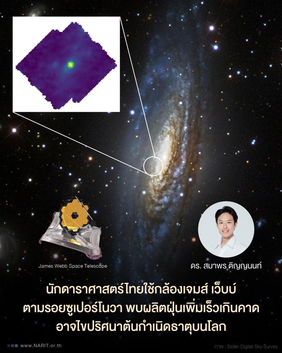 สถาบันวิจัยดาราศาสตร์แห่งชาติ (องค์การมหาชน) (สดร. หรือ NARIT) กระทรวงการอุดมศึกษา วิทยาศาสตร์ วิจัย และนวัตกรรม (อว.) เผย ดร. สมาพร ติญญนนท์ นักวิจัย สถาบันวิจัยดาราศาสตร์แห่งชาติ (NARIT) ใช้กล้องโทรทรรศน์อวกาศเจมส์ เว็บบ์ (JWST) ติดตามการระเบิดของซูเปอร์โนวา 2014C พบการก่อตัวของปริมาณฝุ่นที่เพิ่มขึ้นในอัตราสูงผิดปกติ ขยายขอบเขตความเข้าใจในปัจจุบันเกี่ยวกับการเกิดฝุ่นของซูเปอร์โนวา เผยให้เห็นถึงกระบวนการใหม่ที่ยังไม่เคยค้นพบมาก่อน และอาจนำไปสู่การไขปริศนาต้นกำเนิดธาตุบนโลก งานวิจัยดังกล่าวตีพิมพ์ลงในวารสาร Astrophysical Journal