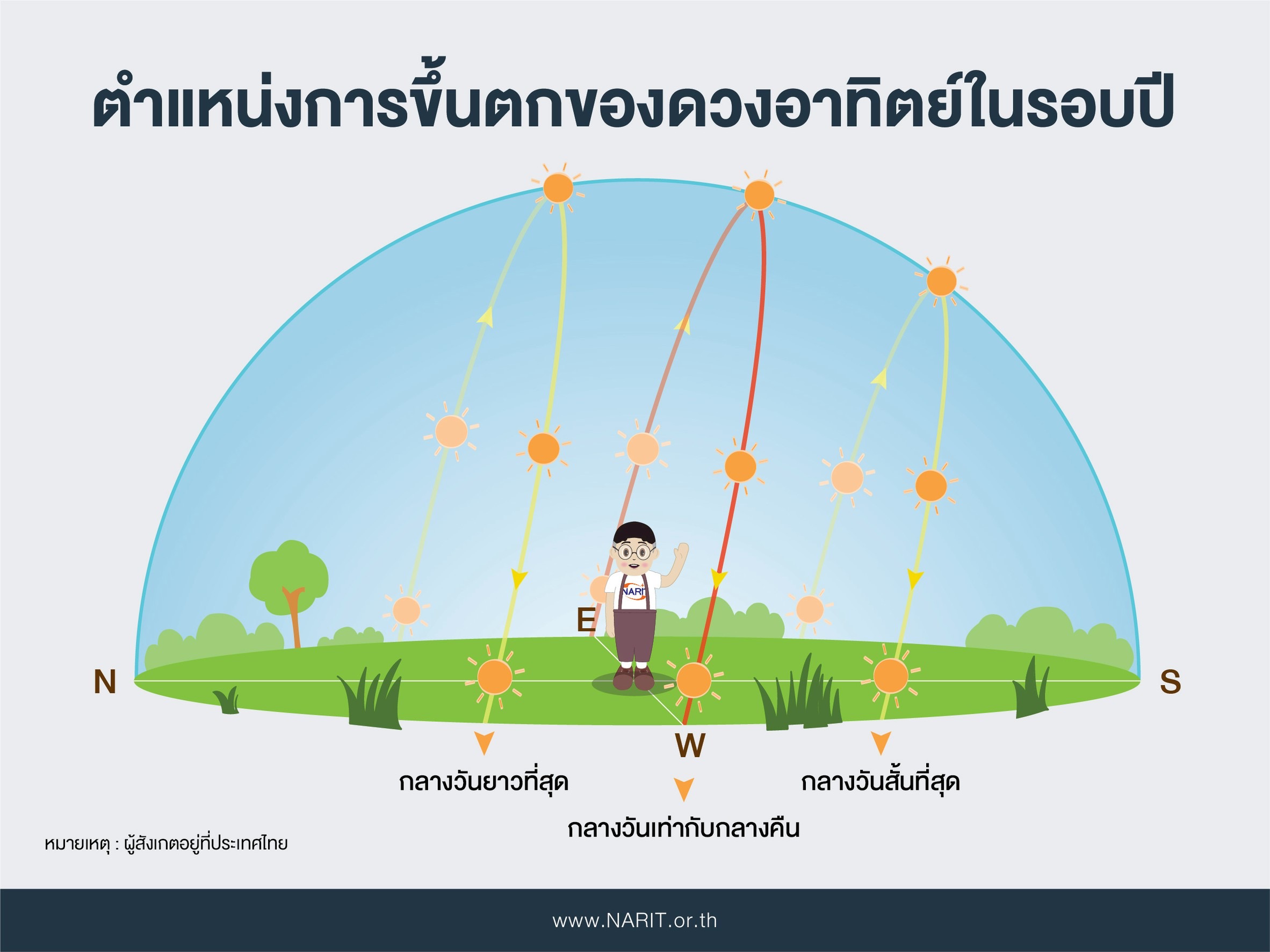 สำหรับปรากฏการณ์ต่อไปที่เกี่ยวข้องกับการขึ้น-ตกของดวงอาทิตย์ คือ “วันครีษมายัน” (Summer Solstice) ในวันที่ 21 มิถุนายน 2569 เป็นวันที่ดวงอาทิตย์ขึ้นทางทิศตะวันออกเฉียงไปทางเหนือมากที่สุด และตกทางทิศตะวันตกเฉียงไปทางเหนือมากที่สุด ทำให้มีช่วงเวลากลางวันยาวนานที่สุดในรอบปี ส่งผลให้ประเทศทางซีกโลกเหนือย่างเข้าสู่ฤดูร้อน และประเทศทางซีกโลกใต้ย่างเข้าสู่ฤดูหนาว