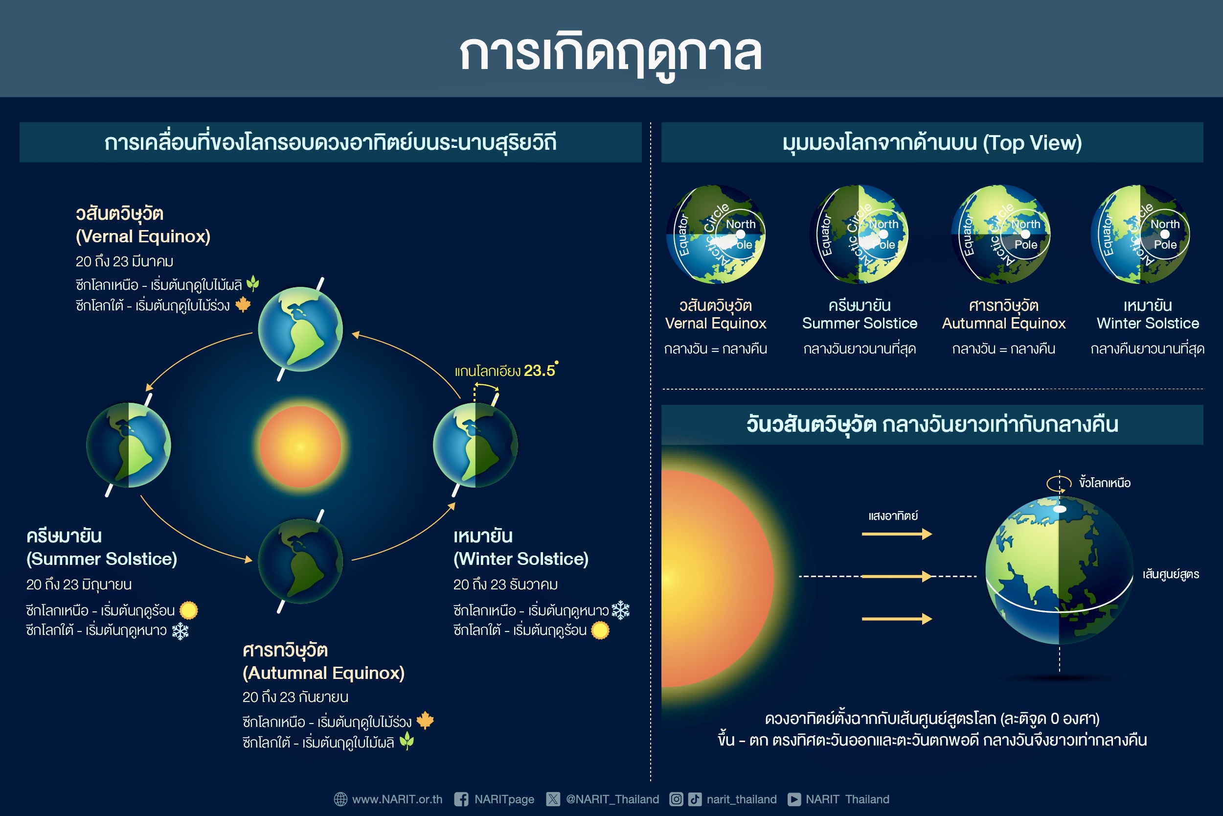 นายศุภฤกษ์ กล่าวเพิ่มเติมว่า “ฤดูกาล” บนโลกนั้น เกิดจากแกนโลกเอียงทำมุม 23.5 องศา กับแนวตั้งฉากกับระนาบโคจรของโลกรอบดวงอาทิตย์ ทำให้พื้นที่ต่าง ๆ ทั่วโลกได้รับความเข้มของแสงอาทิตย์ (มุมตกกระทบ) และปริมาณพลังงานความร้อนไม่เท่ากัน ส่งผลให้มีอุณหภูมิต่างกัน รวมถึงระยะเวลากลางวัน และกลางคืนก็ต่างกันด้วย เหตุนี้ทำให้เกิดฤดูกาลขึ้นบนโลกนั่นเอง จะสังเกตได้ว่าในฤดูร้อน เวลากลางวันจะยาวกว่ากลางคืน ดวงอาทิตย์จะขึ้นเร็วและตกช้า แตกต่างกับฤดูหนาวที่เวลากลางคืนจะยาวนานกว่ากลางวัน ดวงอาทิตย์จะขึ้นช้าและตกเร็ว