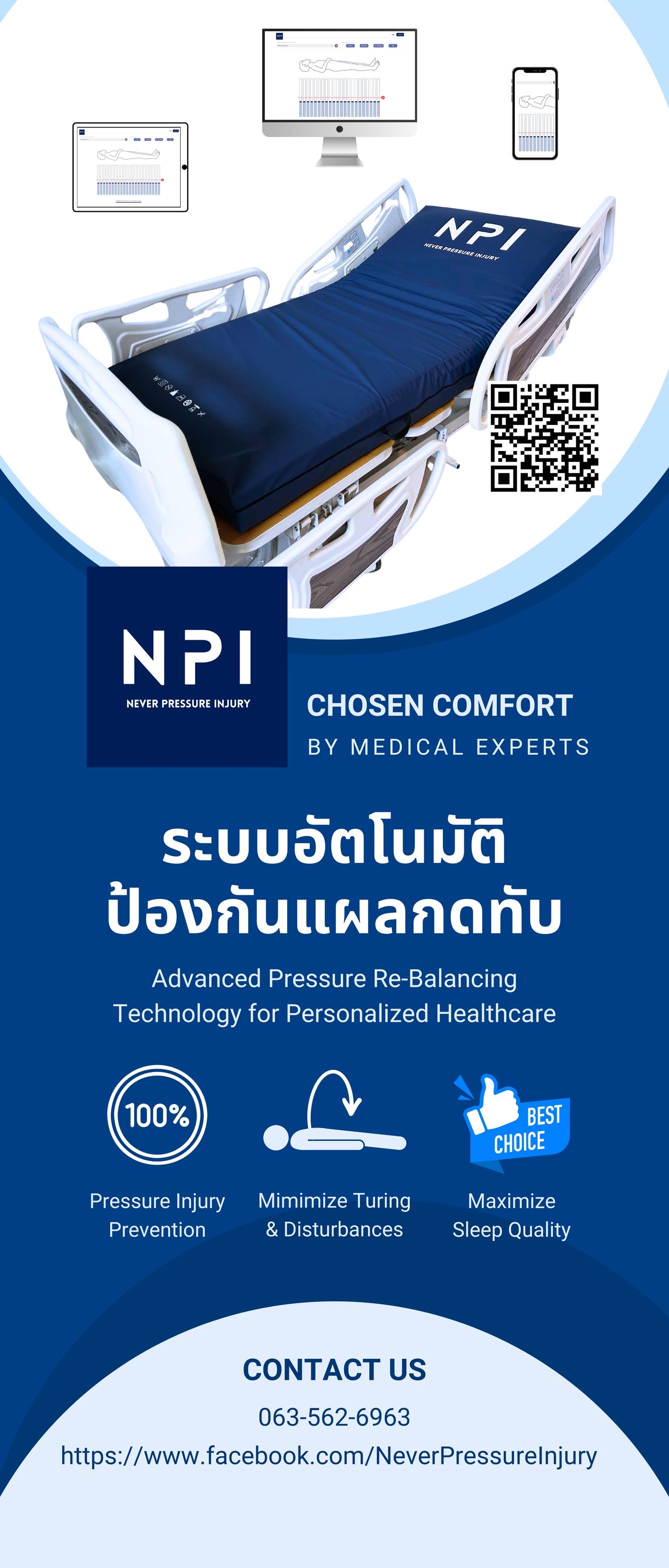 NPI ไม่ได้เป็นเพียงที่นอนที่ขยับได้เอง แต่เป็นนวัตกรรม ”หุ่นยนต์ในรูปแบบที่นอน” ด้วยระบบ AI Robotic ที่ออกแบบมาเพื่อจัดการแรงกดทับอย่างต่อเนื่องและแม่นยำ แตกต่างจากที่นอนลมทั่วไปที่ทำงานด้วยการสลับยุบพองตามรอบเวลา เพราะ NPI สามารถปรับการรองรับให้สอดรับกับสรีระของผู้ป่วยได้ตลอด 24 ชั่วโมงอย่างนุ่มนวล โดยไม่รบกวนการนอนและไม่จำเป็นต้องพลิกตัวผู้ป่วยบ่อย ๆ ส่งผลให้ผู้ป่วยนอนนิ่งได้ต่อเนื่อง สบายขึ้น และช่วยลดแรงกดทับในจุดเสี่ยงได้ดีกว่าที่นอนป้องกันแผลกดทับแบบทั่วไป โดยเฉพาะในบริเวณที่ต้องการการดูแลเป็นพิเศษ