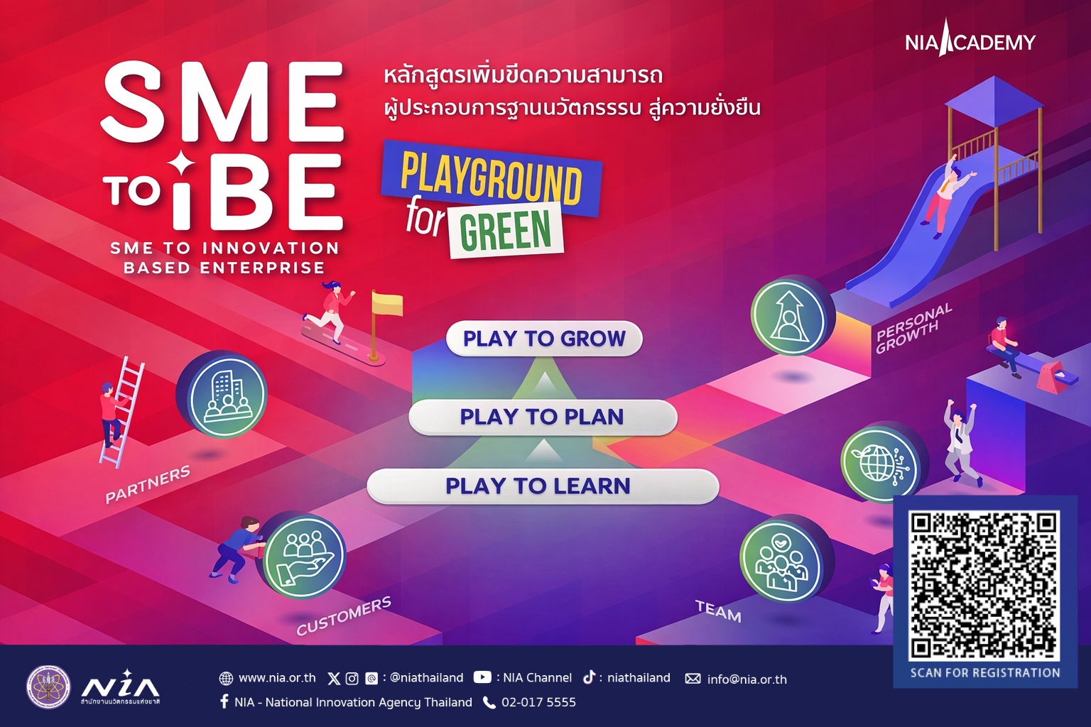 กรุงเทพฯ 19 มีนาคม 2569 – สำนักงานนวัตกรรมแห่งชาติ (องค์การมหาชน) หรือ NIA กระทรวงการอุดมศึกษา วิทยาศาสตร์ วิจัยและนวัตกรรม (อว.) โดยสถาบันวิทยาการนวัตกรรม (NIA Academy) เปิดรับสมัครผู้ประกอบการเอสเอ็มอี ที่สนใจพัฒนาธุรกิจให้เติบโตอย่างยั่งยืนด้วยนวัตกรรม เข้าร่วมเสริมสร้างศักยภาพการนำแนวคิดและเครื่องมือนวัตกรรมมาประยุกต์ใช้ในการพัฒนาธุรกิจ พร้อมต่อยอดสู่โอกาสใหม่ในตลาด กับหลักสูตรเพิ่มขีดความสามารถผู้ประกอบการฐานนวัตกรรมสู่ความยั่งยืน (SME to IBE : Playground for Green)