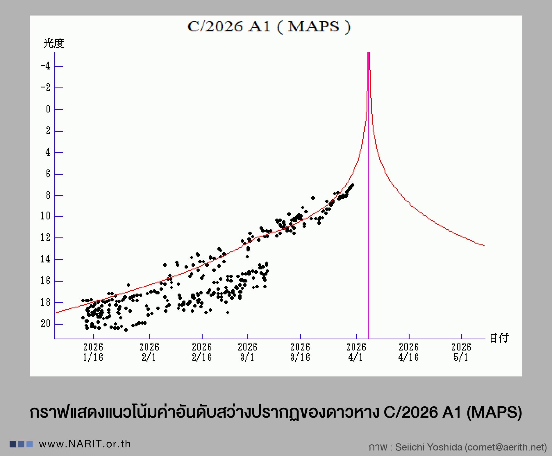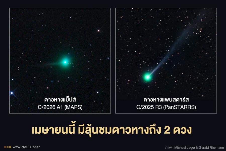 สถาบันวิจัยดาราศาสตร์แห่งชาติ (องค์การมหาชน) (สดร.) หรือ NARIT กระทรวงการอุดมศึกษา วิทยาศาสตร์ วิจัยและนวัตกรรม (อว.) เผย เมษายนนี้ คนไทยมีลุ้นได้ชมดาวหางถึง 2 ดวง ได้แก่ “ดาวหางแม็ปส์” หรือ C/2026 A1 (MAPS) ช่วงต้นเดือน และ “ดาวหางแพนสตาร์ส” หรือ C/2025 R3 (PanSTARRS) ช่วงกลางเดือนเป็นต้นไป ขณะนี้ดาวหางทั้งสองดวงกำลังโคจรเข้าใกล้ดวงอาทิตย์ หากเหลือรอดอาจสังเกตเห็นได้ด้วยตาเปล่า