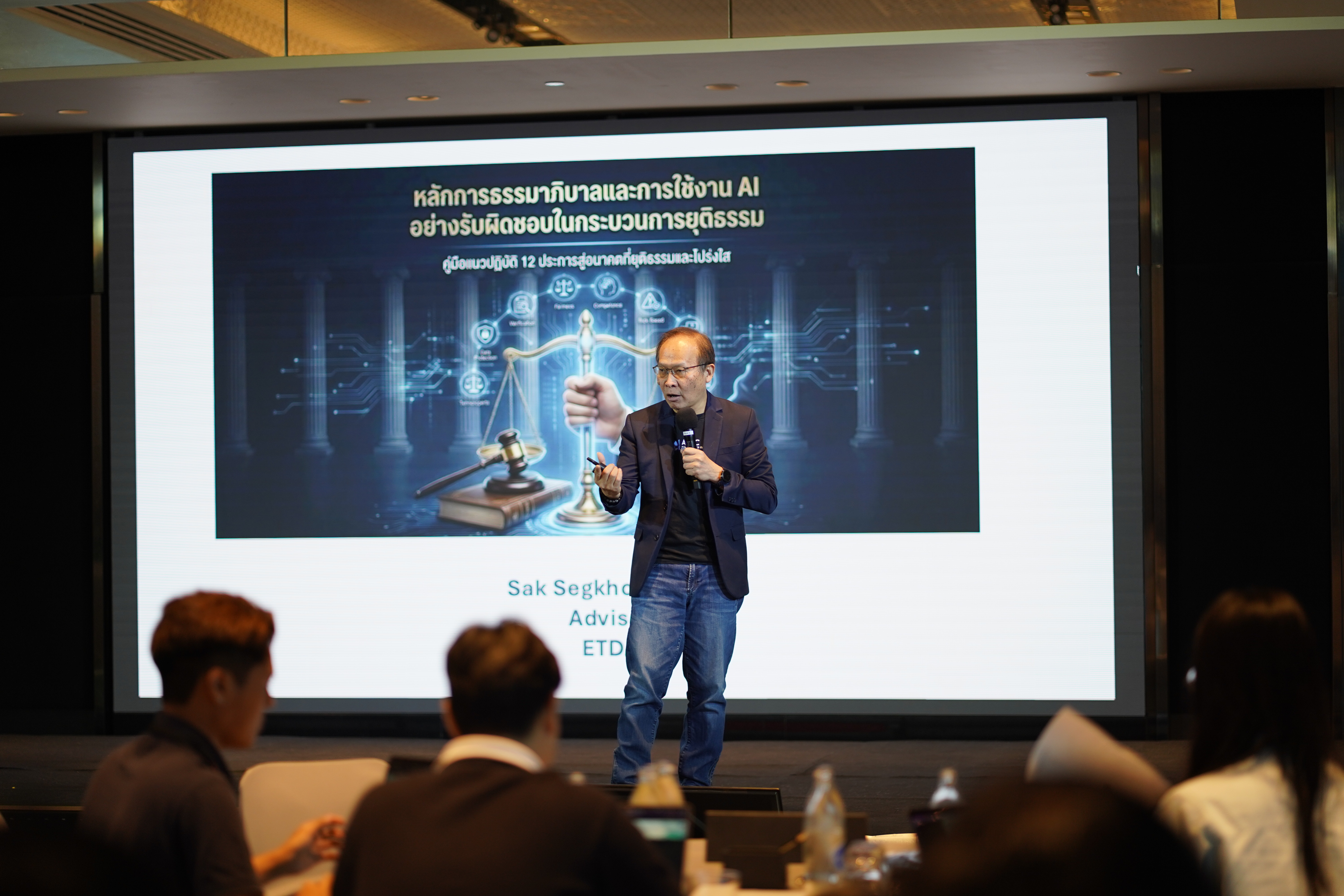 ดร.ศักดิ์ เสกขุนทด ที่ปรึกษาอาวุโส ETDA กล่าวเสริมว่า การนำ AI มาใช้ในกระบวนการยุติธรรม ถือเป็นบริบทที่มีความอ่อนไหวและมีความเสี่ยงเฉพาะสูง เนื่องจากเกี่ยวข้องโดยตรงกับสิทธิ เสรีภาพ และทรัพย์สินของประชาชน โดยความเสี่ยงสำคัญอาจเกิดจากความคลาดเคลื่อนของข้อมูล การอ้างอิงข้อกฎหมายที่ไม่ถูกต้อง อคติของระบบ ตลอดจนความเสี่ยงด้านการรั่วไหลของข้อมูลสำคัญ ซึ่งล้วนส่งผลกระทบต่อความน่าเชื่อถือของกระบวนการยุติธรรมในภาพรวม ดังนั้น ทิศทางการพัฒนาและการใช้งาน AI ในภาคส่วนนี้ จำเป็นต้องตั้งอยู่บนหลัก “Responsible AI” โดยยึดให้มนุษย์ยังคงเป็นผู้รับผิดชอบต่อผลลัพธ์อย่างเต็มรูปแบบ และไม่ใช้ AI แทนดุลพินิจในสาระสำคัญของกระบวนการยุติธรรม ขณะเดียวกัน การนำ AI มาใช้ต้องตั้งอยู่บนฐานของข้อมูลที่ผ่านการตรวจสอบจากแหล่งที่เชื่อถือได้ สามารถอธิบายเหตุผลของผลลัพธ์ได้อย่างชัดเจน และไม่พึ่งพาระบบที่ไม่สามารถตรวจสอบที่มาได้ พร้อมกันนี้ การออกแบบและใช้งาน AI ต้องคำนึงถึงความโปร่งใส โดยสามารถระบุได้อย่างชัดเจนว่า AI มีบทบาทในขั้นตอนใดของกระบวนการ มีระบบบันทึกการใช้งานเพื่อรองรับการตรวจสอบย้อนหลัง รวมถึงต้องให้ความสำคัญกับการคุ้มครองข้อมูลส่วนบุคคลและข้อมูลความลับของคดีอย่างเคร่งครัด ตลอดจนการประเมินและกำหนดกรอบการใช้งานตามระดับความเสี่ยงของงานในแต่ละประเภทอย่างเหมาะสมนอกจากนี้ ยังจำเป็นต้องเสริมสร้างความรู้ความเข้าใจของผู้ใช้งานให้ตระหนักถึงข้อจำกัดของ AI สามารถใช้งานได้อย่างเหมาะสมและเป็นกลาง รวมถึงมีแนวทางในการรับมือเมื่อเกิดความคลาดเคลื่อนของระบบ เพื่อป้องกันผลกระทบที่อาจเกิดขึ้นในเชิงระบบและสร้างความเชื่อมั่นต่อการนำเทคโนโลยีมาใช้ในระยะยาว