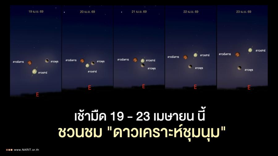 ทั้งนี้ สามารถสังเกตดาวเคราะห์ทั้ง 3 ดวง ปรากฏใกล้กันในช่วงเช้ามืด จนถึงวันที่ 23 เมษายน 2569 ตลอดทั้ง 5 วันนี้ เริ่มสังเกตปรากฏการณ์ได้ทางทิศตะวันออก ตั้งแต่เวลาประมาณ 05:00 น. จนถึงรุ่งเช้า