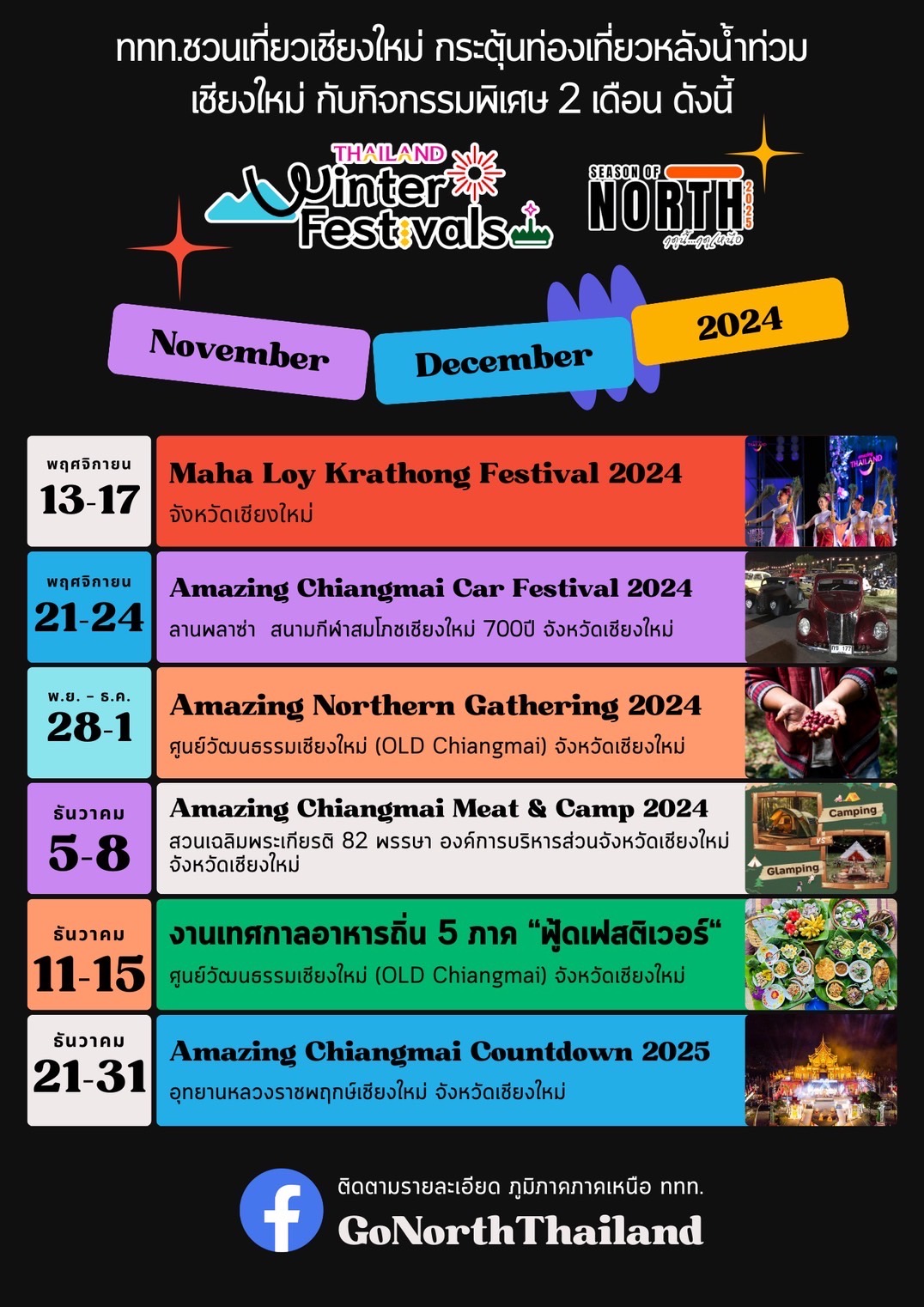 นายสมชาย ชมภูน้อย ผู้อำนวยการภูมิภาคภาคเหนือ การท่องเที่ยวแห่งประเทศไทย (ททท.) ได้ให้ข่าว ทิศทางการกระตุ้นตลาดท่องเที่ยวหลังจากสถานการณ์น้ำท่วม ผ่านการเยียวยา ฟื้นฟู และกระตุ้นตลาด “เหนือพร้อมเที่ยว” โปรโมชั่น “แอ่วเหนือคนละครึ่ง” ที่ผ่านมา พร้อมส่งเสริมการตลาดเชิงรุก “แอ่วเหนือหน้าหนาวWinterFestval“ ในรูปแบบกิจกรรมท่องเที่ยวในภาคเหนือ ประจำเดือนพฤศจิกายน-ธันวาคม 2567 กับTheme เปิดตัว ”SEASON OF NORTH = ฤดูนี้….ฤดูเหนือ….(ฤดูหนาว&ดอกไม้)“ กับ “มุม(ไม่)ลับ เที่ยวภาคเหนือ….ห้ามพลาด”