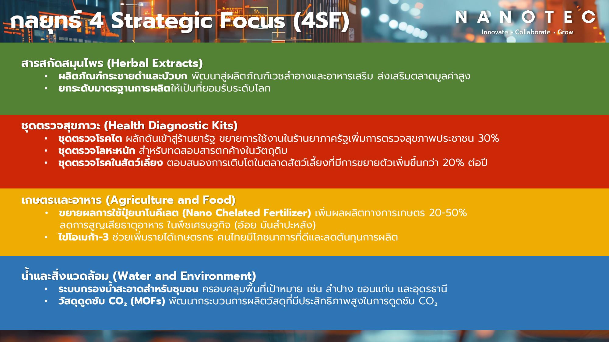 นาโนเทค สวทช. ในปี 2568 จะเดินหน้าตามแนวคิด Innovate Collaborate and Grow ที่จะให้ความสำคัญกับ 3 ปัจจัย คือ นวัตกรรม ความร่วมมือกับพันธมิตร และการเติบโตอย่างยั่งยืน ผ่านกลยุทธ์ที่เรียกว่า 4 Strategic Focus (SF) หรือกลไกการผลักดันเทคโนโลยียกระดับคุณภาพชีวิตประชาชน (improve quality of life) เพื่อผลักดันให้เกิดการพัฒนาต่อยอดผลงานวิจัยนาโนเทค ที่มุ่งเป้าเพื่อแก้ไขปัญหาตามโจทย์ความต้องการของประเทศ ยกระดับคุณภาพชีวิตของคนไทย เพิ่มมูลค่าทางเศรษฐกิจ เสริมแกร่งความสามารถในการแข่งขัน ได้แก่ สารสกัดสมุนไพร ชุดตรวจสุขภาวะ เกษตรและอาหาร และ น้ำและสิ่งแวดล้อม