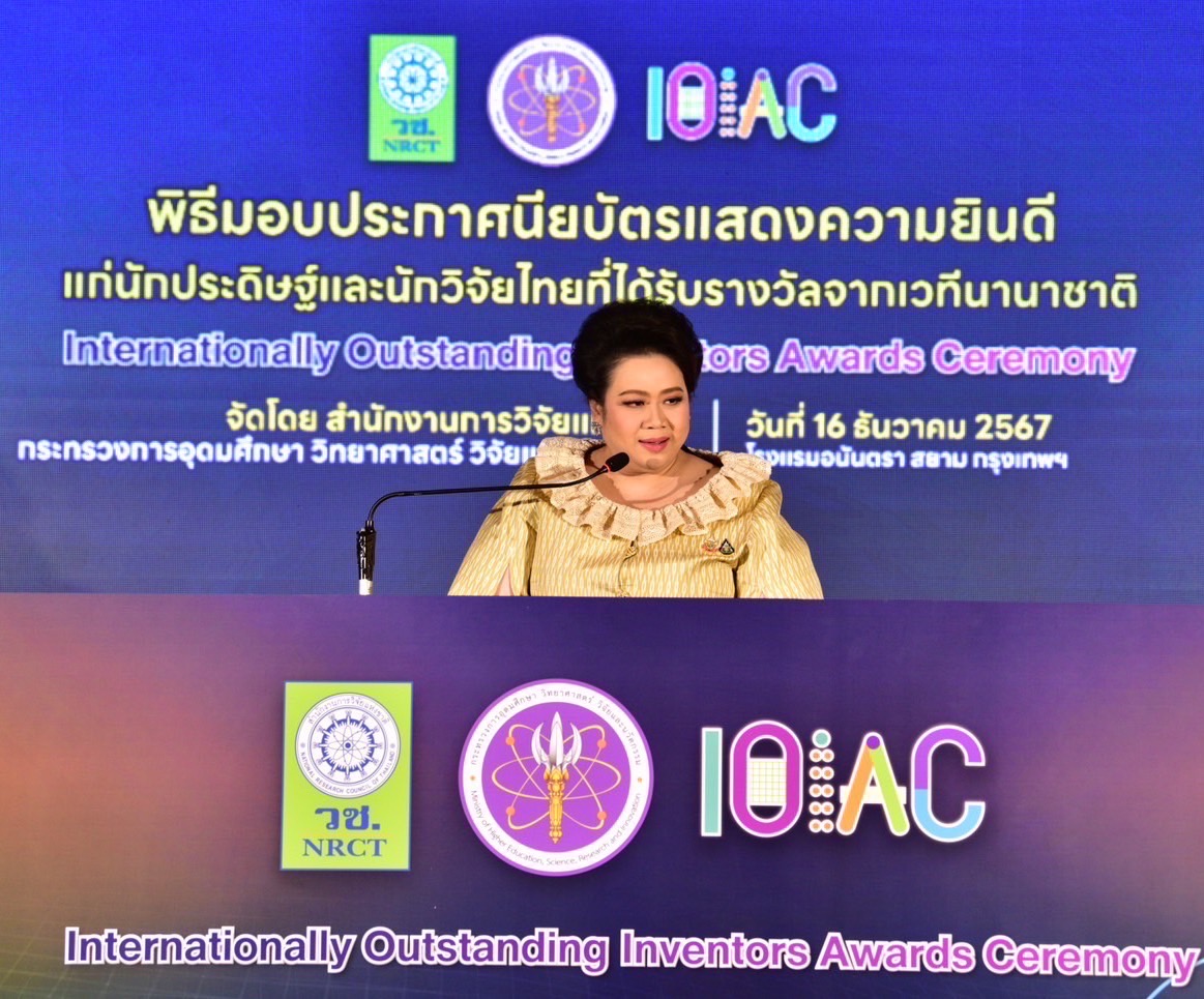วันที่ 16 ธันวาคม 2567 กระทรวงการอุดมศึกษา วิทยาศาสตร์ วิจัยและนวัตกรรม โดย สำนักงานการวิจัยแห่งชาติ (วช.) จัดพิธีมอบประกาศนียบัตรแสดงความยินดีแก่นักประดิษฐ์และนักวิจัยไทยที่ชนะรางวัลจากเวทีนานาชาติ (Internationally Outstanding Inventors Awards Ceremony) โดยได้รับเกียรติจาก นางสาวศุภมาส อิศรภักดี รัฐมนตรีว่าการกระทรวงการอุดมศึกษา วิทยาศาสตร์ วิจัยและนวัตกรรม เป็นประธานในพิธี พร้อมด้วย ดร.วิภารัตน์ ดีอ่อง ผู้อำนวยการสำนักงานการวิจัยแห่งชาติ กล่าวรายงาน เพื่อแสดงความยินดีกับนักประดิษฐ์นักวิจัยไทยในโอกาสที่สร้างชื่อเสียงให้กับประเทศและสร้างการยอมรับในความสามารถและมาตรฐานของสิ่งประดิษฐ์นวัตกรรมฝีมือของนักประดิษฐ์นักวิจัยไทย ณ โรงแรมอนันตรา สยาม กรุงเทพฯ