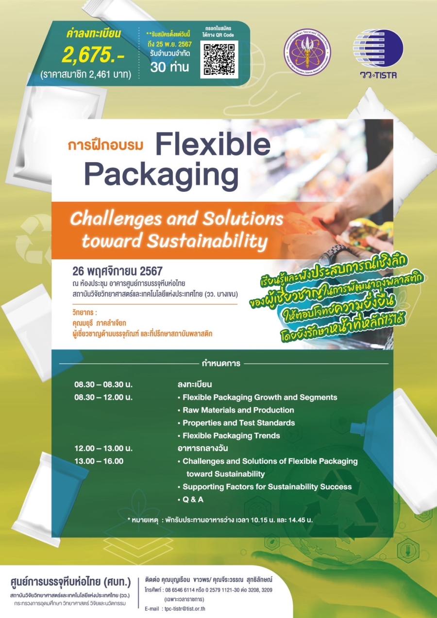 กระทรวงการอุดมศึกษา วิทยาศาสตร์ วิจัยและนวัตกรรม (วว.) โดย ศูนย์การบรรจุหีบห่อไทย (ศบท.) สถาบันวิจัยวิทยาศาสตร์และเทคโนโลยีแห่งประเทศไทย (วว.) จัดการอบรมหลักสูตร บรรจุภัณฑ์แบบยืดหยุ่น : ความท้าทายและแนวทางแก้ไขสู่ความยั่งยืน (Flexible Packaging : Challenges and Solutions toward Sustainability) ในวันที่ 26 พฤศจิกายน 2567 เวลา 8.30-16.00 น. ณ ห้องประชุม ศบท. วว. บางเขน