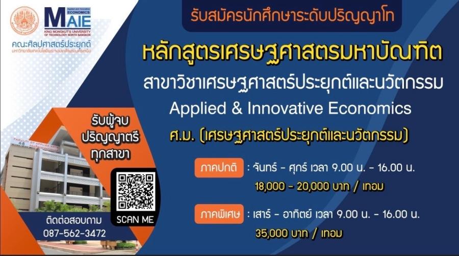 คณะศิลปศาสตร์ประยุกต์ มหาวิทยาลัยเทคโนโลยีพระจอมเกล้าพระนครเหนือ (มจพ.) เปิดรับสมัครนักศึกษา ระดับปริญญาโท รุ่นที่ 1 ภาคการศึกษาที่ 1/2568 ในหลักสูตร“เศรษฐศาสตรมหาบัณฑิต สาขาวิชาเศรษฐศาสตร์ประยุกต์และนวัตกรรม” M. Econ (Applied and Innovative Economics) (หลักสูตรใหม่ ปี 2567) รับสมัครตั้งแต่วันนี้เป็นต้นไป ทางเว็ปไซต์ของบัณฑิตวิทยาลัย