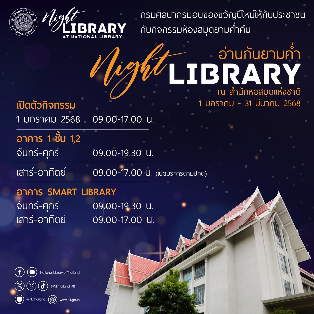 5. กิจกรรม Night Library อ่านกันยามค่ำ ณ สำนักหอสมุดแห่งชาติ วันที่ 1 มกราคม – 31 มีนาคม 2568หอสมุดแห่งชาติ เปิดให้บริการ อาคาร 1 ชั้น 1 2 และอาคาร Smart Library วันจันทร์ – ศุกร์ เวลา 09.00 – 19.30 น. วันเสาร์ – อาทิตย์ เวลา 09.00 – 17.00 น.