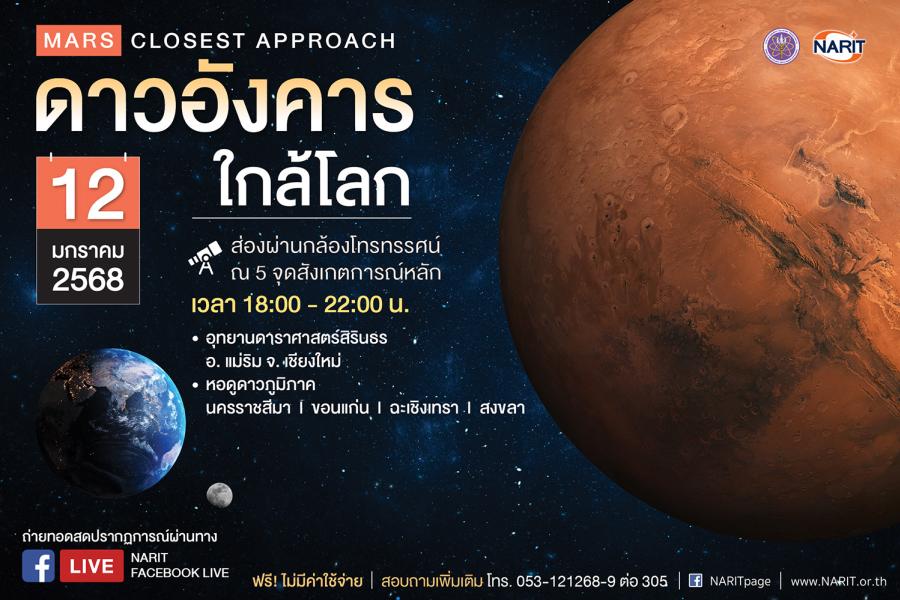 สถาบันวิจัยดาราศาสตร์แห่งชาติ (องค์การมหาชน) (สดร. หรือ NARIT) กระทรวงการอุดมศึกษา วิทยาศาสตร์ วิจัยและนวัตกรรม (อว.) เผย 12 มกราคม 2568 “ดาวอังคารใกล้โลกที่สุด” ปรากฏสว่างสีส้มแดงบนท้องฟ้า ตลอดคืนจนถึงรุ่งเช้า สังเกตได้ด้วยตาเปล่า หากชมผ่านกล้องโทรทรรศน์กำลังขยายตั้งแต่ 100 เท่าขึ้นไป จะเห็นพื้นน้ำแข็งสีขาวบริเวณขั้วของดาวอังคารได้ NARIT ชวนมาส่องดาวอังคารผ่านกล้องโทรทรรศน์ 5 จุดหลัก ณ อุทยานดาราศาสตร์สิรินธร เชียงใหม่ และหอดูดาวภูมิภาค นครราชสีมา ขอนแก่น ฉะเชิงเทรา และสงขลา ตั้งแต่เวลา 18:00-22:00 น. ฟรี! และรับชมถ่ายทอดสดปรากฏการณ์ผ่านเฟซบุ๊ก NARIT สถาบันวิจัยดาราศาสตร์แห่งชาติ