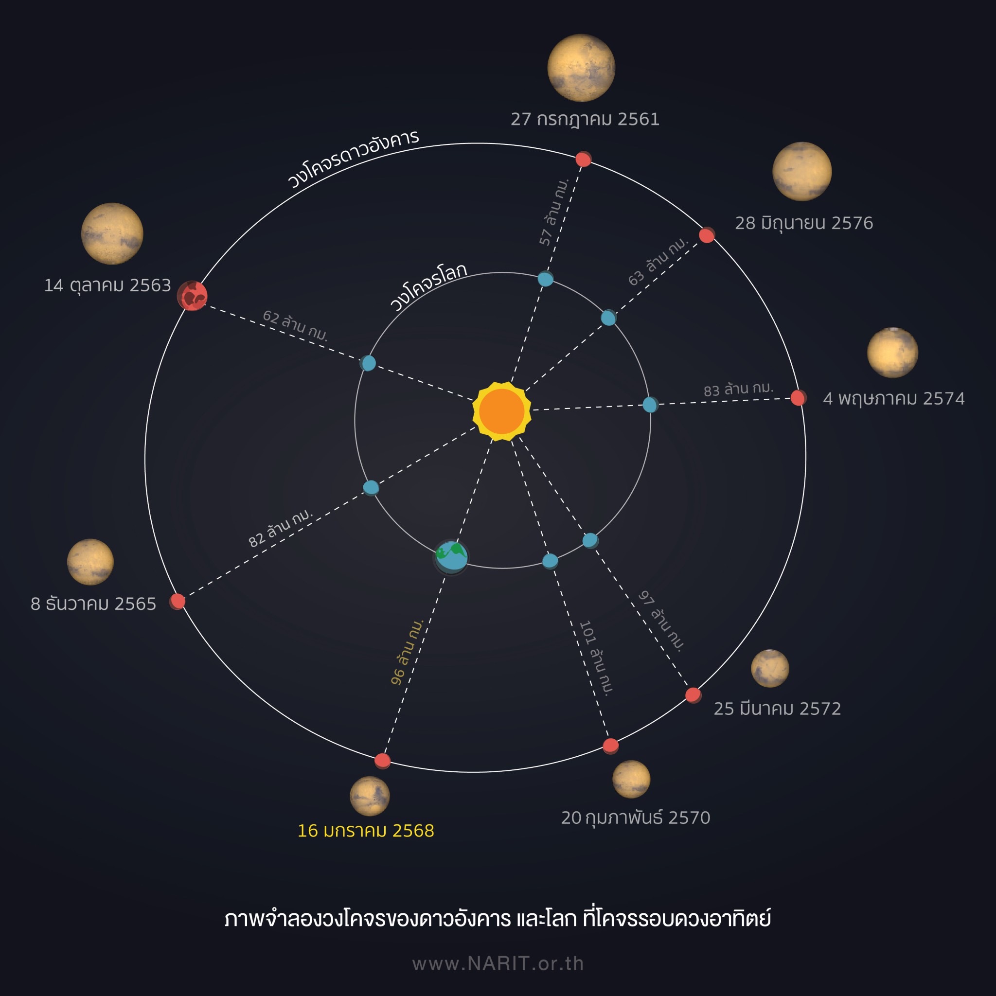 นายศุภฤกษ์ คฤหานนท์ ผู้จัดการศูนย์บริการวิชาการและสื่อสารทางดาราศาสตร์ เปิดเผยว่า ช่วงวันที่ 12 - 16 มกราคม 2568 เป็นช่วงเวลาเหมาะสมในการสังเกตการณ์ดาวอังคารมากที่สุด เนื่องจากคืนวันที่ 12 มกราคม 2568 ดาวอังคารจะโคจรมาอยู่ตำแหน่งใกล้โลกที่สุด ที่ระยะห่างประมาณ 96 ล้านกิโลเมตร และหลังจากนั้นจะโคจรไปอยู่ในตำแหน่งตรงข้ามดวงอาทิตย์วันที่ 16 มกราคม 2568 ช่วงดังกล่าวสามารถสังเกตดาวอังคารได้ตลอดทั้งคืน ตั้งแต่ดวงอาทิตย์ลับขอบฟ้า ทางทิศตะวันออกเฉียงเหนือ จนถึงดวงอาทิตย์ขึ้นในเช้าวันถัดไป หากสังเกตด้วยตาเปล่าจะเห็นดาวอังคารส่องสว่างประกายสีส้มแดงบนท้องฟ้า และเมื่อสังเกตการณ์ผ่านกล้องโทรทรรศน์ที่มีกำลังขยายตั้งแต่ 100 เท่าขึ้นไป จะเห็นพื้นน้ำแข็งสีขาวที่อยู่บริเวณขั้วของดาวอังคารได้