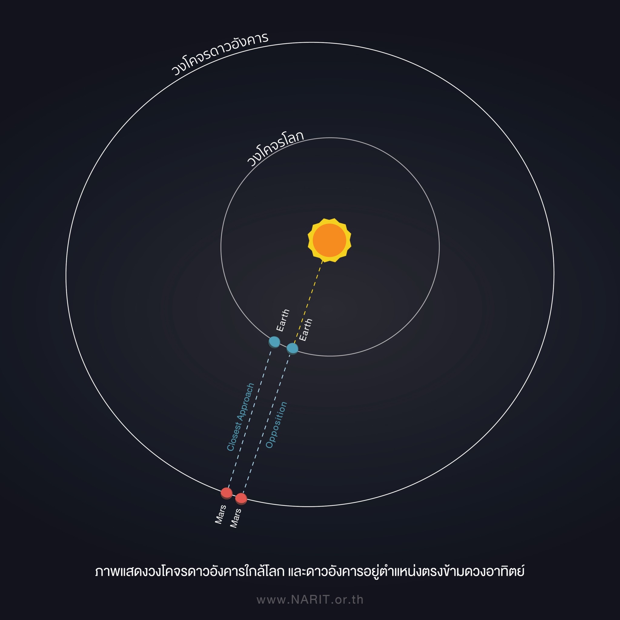 ดาวอังคารไม่ได้เข้าใกล้โลกมากที่สุดในตำแหน่งตรงข้ามดวงอาทิตย์พอดีเหมือนดาวพฤหัสบดี หรือดาวเสาร์ เนื่องจากวงโคจรของดาวอังคารค่อนข้างรี จึงทำให้วันที่ดาวอังคารเข้าใกล้โลกมากที่สุดนั้นเคลื่อนไปจากวันที่ดาวอังคารอยู่ในตำแหน่งตรงข้ามดวงอาทิตย์เล็กน้อย ซึ่งดาวอังคารจะเคลื่อนมาอยู่ในตำแหน่งนี้ทุก ๆ 26 เดือน และโคจรจะมาใกล้โลกในครั้งถัดไปวันที่ 20 กุมภาพันธ์ 2570