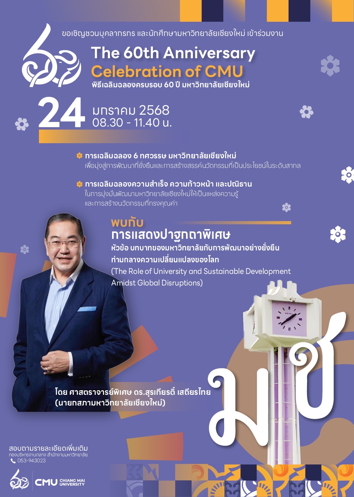 วันที่ 24 มกราคม 2568 ช่วงเช้า : จะมีพิธีเฉลิมฉลองครบรอบ 60 ปี แห่งการสถาปนามหาวิทยาลัยเชียงใหม่ พิธีเปิดงานเฉลิมฉลองครบรอบ 60 ปี แห่งการสถาปนามหาวิทยาลัยเชียงใหม่ ปาฐกถาพิเศษ โดยศาสตราจารย์พิเศษ ดร.สุรเกียรติ์ เสถียรไทย นายกสภามหาวิทยาลัยเชียงใหม่ หัวข้อ บทบาทของมหาวิทยาลัยกับการพัฒนาอย่างยั่งยืนท่ามกลางความเปลี่ยนแปลงของโลก ณ หอประชุม มช.