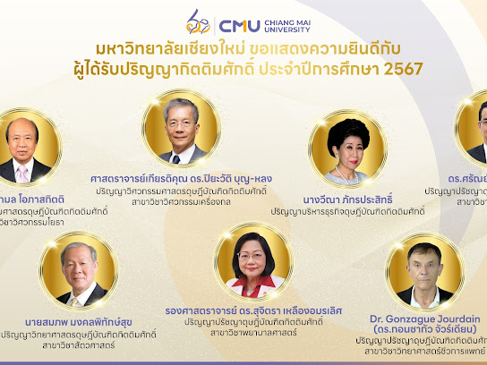 ในพิธีพระราชทานปริญญาบัตรครั้งนี้ สภามหาวิทยาลัยเชียงใหม่ได้อนุมัติปริญญากิตติมศักดิ์แก่ผู้ทรงคุณวุฒิ จำนวน 7 ท่าน ได้แก่ นายกมล โอภาสกิตติ ปริญญาวิศวกรรมศาสตรดุษฎีบัณฑิตกิตติมศักดิ์ สาขาวิชาวิศวกรรมโยธา ศาสตราจารย์เกียรติคุณ ดร.ปิยะวัติ บุญ-หลง ปริญญาวิศวกรรมศาสตรดุษฎีบัณฑิตกิตติมศักดิ์ สาขาวิชาวิศวกรรมเครื่องกล นางวีณา ภัทรประสิทธิ์ ปริญญาบริหารธุรกิจดุษฎีบัณฑิตกิตติมศักดิ์ ดร.ศรัณย์ โปษยะจินดา ปริญญาปรัชญาดุษฎีบัณฑิตกิตติมศักดิ์ สาขาวิชาดาราศาสตร์ นายสมภพ มงคลพิทักษ์สุข ปริญญาวิทยาศาสตรดุษฎีบัณฑิตกิตติมศักดิ์ สาขาวิชาสัตวศาสตร์ รองศาสตราจารย์ ดร.สุจิตรา เหลืองอมรเลิศ ปริญญาปรัชญาดุษฎีบัณฑิตกิตติมศักดิ์ สาขาวิชาพยาบาลศาสตร์ Dr. Gonzague Jourdain (ดร.กอนซากัว จัวร์เดียน)ปริญญาปรัชญาดุษฎีบัณฑิตกิตติมศักดิ์ สาขาวิชาวิทยาศาสตร์ชีวการแพทย์