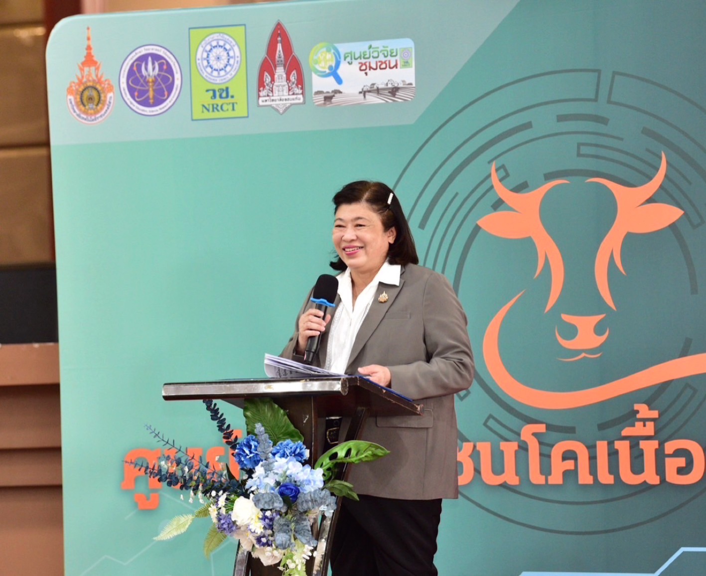 ดร.วิภารัตน์ ดีอ่อง ผู้อำนวยการสำนักงานการวิจัยแห่งชาติ กล่าวว่า การจัดตั้งศูนย์วิจัยชุมชนปัจจุบันได้มีการจัดตั้งศูนย์วิจัยชุมชนแล้วจำนวน 67 ศูนย์ แบ่งเป็น (1) ภาคเหนือ: 26 ศูนย์ (2) ภาคกลาง: 14 ศูนย์ (3) ภาคใต้: 13 ศูนย์ และภาคตะวันออกเฉียงเหนือ: 14 ศูนย์ กิจกรรมในวันนี้ เป็นการเปิดตัวศูนย์วิจัยชุมชนแห่งที่ 15 ดำเนินการโดยเครือข่ายวิจัยภูมิภาค: ภาคตะวันออกเฉียงเหนือ ศูนย์วิจัยชุมชน “โคเนื้อแห่งภาคอีสาน จังหวัดนครราชสีมา” จากรายงานที่ว่า “โคเนื้อ” เป็นสัตว์เศรษฐกิจที่สำคัญของประเทศในภาคอีสาน ปัจจุบันมีจำนวนโคเนื้อกว่า 10 ล้านตัว เกษตรกรไม่น้อยกว่า 1.4 ล้านครัวเรือน ยึดเป็นอาชีพหลัก คิดเป็นร้อยละ 55 ของพื้นที่ ดังนั้น ความรู้จากงานวิจัย นวัตกรรม เทคโนโลยีที่เหมาะสม ที่สำคัญได้แก่ เทคโนโลยีการผสมพันธุ์เพื่อผลิตลูกโค/ฟิคไทม์ เอไอ อาหารโคขุนต้นทุนต่ำ เทคนิคการแปรรูปผลิตภัณฑ์เนื้อโค ฯลฯ ซึ่งได้ถูกรวบรวมขึ้นโดย ศูนย์วิจัยชุมชนฯ แห่งนี้ซึ่งจะก่อให้เกิดผลผลิต ผลลัพธ์ ในการสร้างความเข้มแข็งในทุกภูมิภาคของประเทศ เพิ่มคุณภาพชีวิตแก่ชุมชนให้พึ่งพาตนเองได้ โดยใช้ฐานความรู้จากการวิจัยและนวัตกรรม