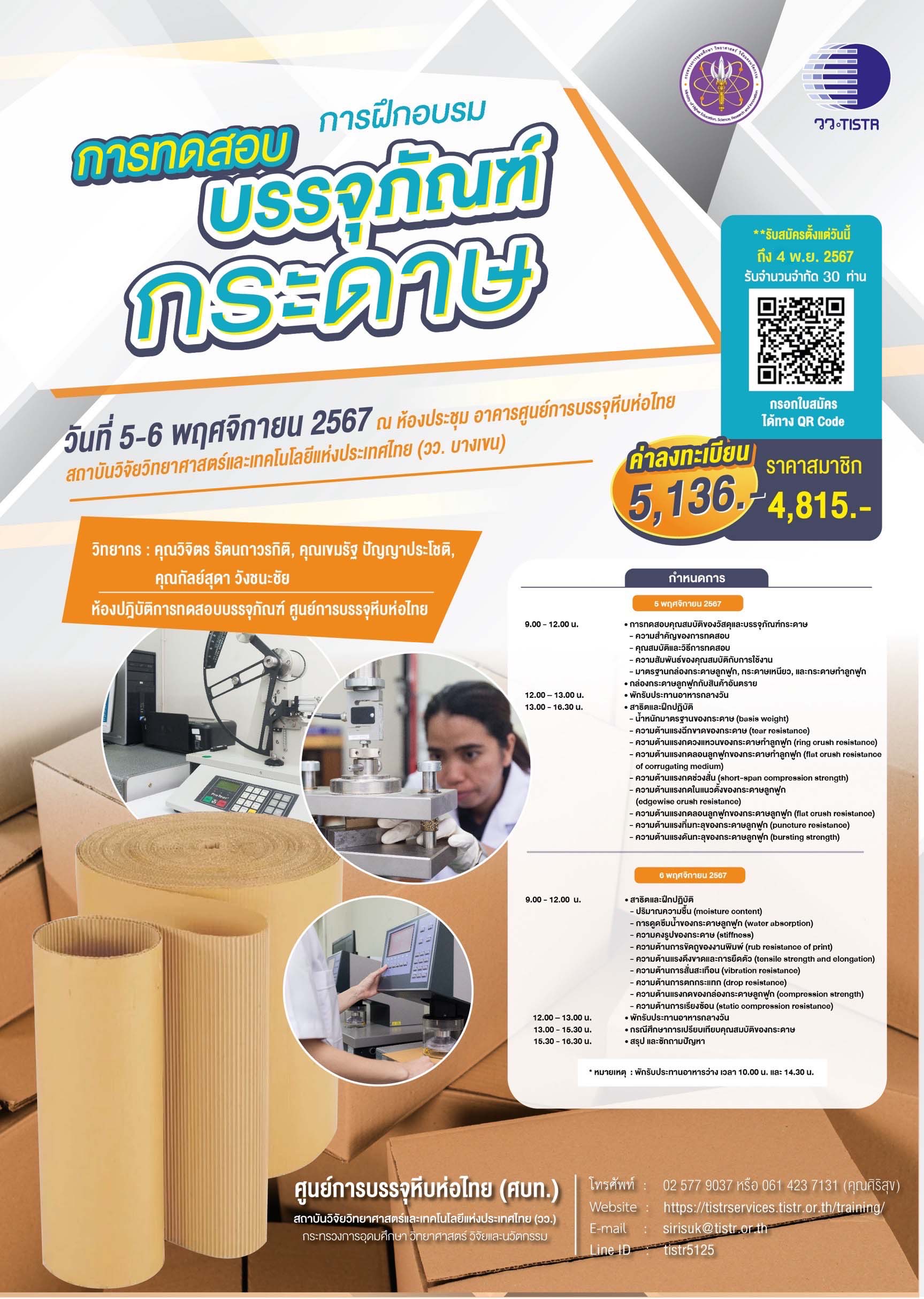 กระทรวงการอุดมศึกษา วิทยาศาสตร์ วิจัยและนวัตกรรม (อว.) โดย ศูนย์การบรรจุหีบห่อไทย (ศบท.) สถาบันวิจัยวิทยาศาสตร์และเทคโนโลยีแห่งประเทศไทย (วว.) จัดการฝึกอบรมหลักสูตร “การทดสอบบรรจุภัณฑ์กระดาษ”ระหว่างวันที่ 5-6 พฤศจิกายน 2567 เวลา 09.00-16.30 น. ณ ห้องประชุม ศบท. วว. บางเขน ถ่ายทอดความรู้โดย คุณวิจิตร รัตนถาวรกิติ คุณเขมรัฐ ปัญญาประโชติ และคุณกัลย์สุดา วังชนะชัย วิทยากรจากห้องปฏิบัติการทดสอบบรรจุภัณฑ์ ศบท. วว. โดยมีเนื้อหาการอบรมประกอบด้วย 1) การทดสอบคุณสมบัติของวัสดุและบรรจุภัณฑ์กระดาษ 2) การสาธิตและฝึกปฏิบัติ และ 3)กรณีศึกษาการเปรียบเทียบคุณสมบัติของกระดาษ **เปิดจองที่นั่งตั้งแต่บัดนี้ถึงวันที่ 4 พฤศจิกายน 2567 รับผู้เข้าร่วมอบรมจำนวนจำกัดเพียง 30 ท่านเท่านั้น**