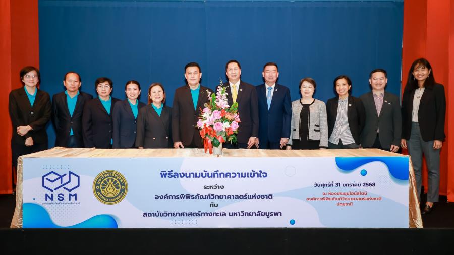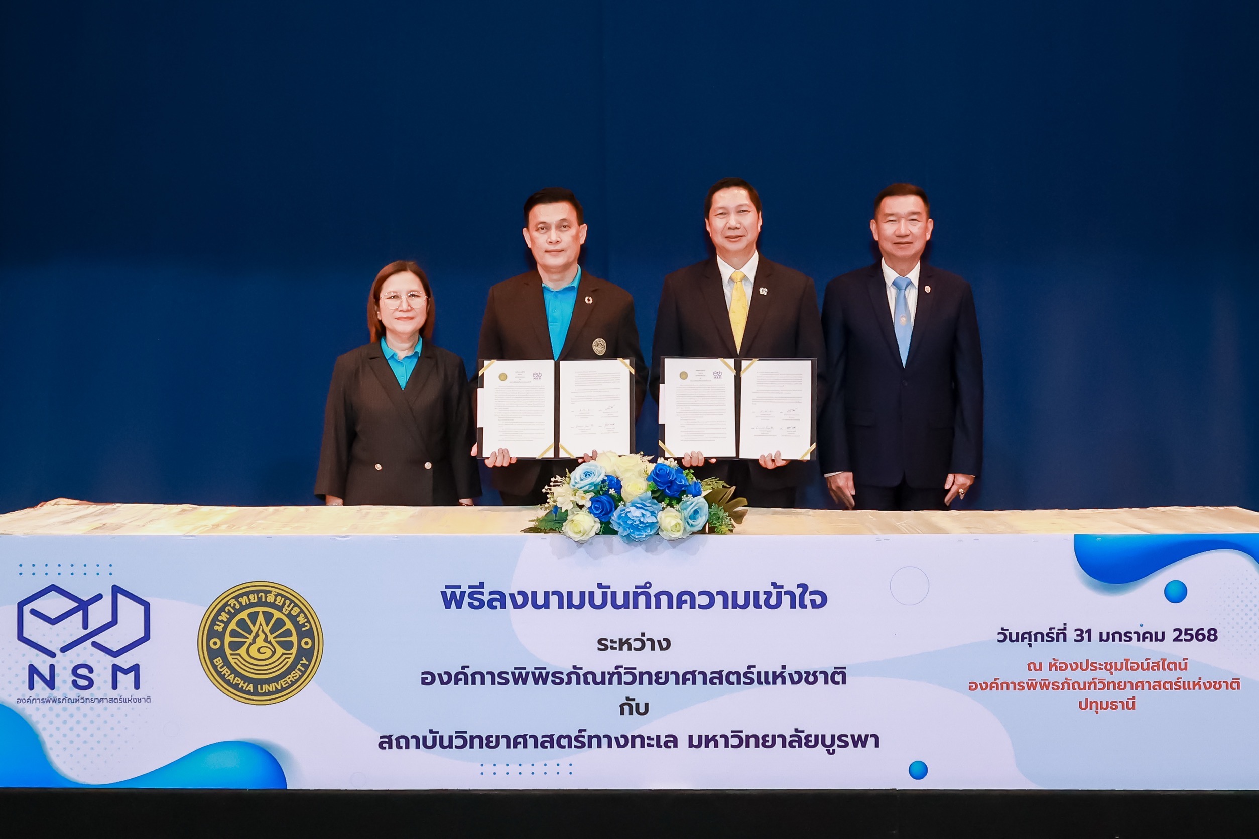 เมื่อวันที่ 31 มกราคม 2568 ผศ.ดร.รวิน ระวิวงศ์ ผู้อำนวยการองค์การพิพิธภัณฑ์วิทยาศาสตร์แห่งชาติ (อพวช.) หรือ NSM ลงนามความร่วมมือกับ ดร.บัลลังก์ เนื่องแสง ผู้อำนวยการสถาบันวิทยาศาสตร์ทางทะเล มหาวิทยาลัยบูรพา เพื่อร่วมกันพัฒนาและถ่ายทอดองค์ความรู้ด้านวิทยาศาสตร์ทางทะเลตลอดจนความหลากหลายทางชีวภาพ พร้อมสร้างแรงบันดาลใจให้ทุกคนเห็นคุณค่าความสำคัญของธรรมชาติและสิ่งมีชีวิต โดยมี นายสุวรงค์ วงษ์ศิริ รองผู้อำนวยการ NSM พร้อมด้วยดร.จันทร์จรัส วัฒนะโชติ รองผู้อำนวยการสถาบันวิทยาศาสตร์ทางทะเล มหาวิทยาลัยบูรพา ร่วมเป็นสักขีพยานในพิธีลงนามฯ ดังกล่าว ณ อพวช. ต.คลองห้า อ.คลองหลวง จ.ปทุมธานี