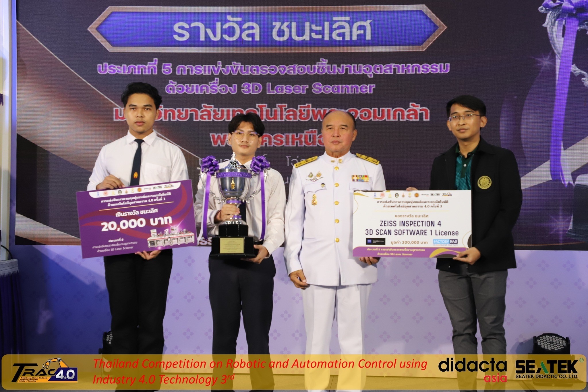 ทีมนักศึกษา ภาควิชาเทคโนโลยีวิศวกรรมเครื่องกล วิทยาลัยเทคโนโลยีอุตสาหกรรม มหาวิทยาลัยเทคโนโลยีพระจอมเกล้าพระนครเหนือ (มจพ.) คว้า 2 รางวัลชนะเลิศ จากการแข่งขันการควบคุมหุ่นยนต์และระบบอัตโนมัติด้วยเทคโนโลยีอุตสาหกรรม 4.0 ประเภทที่ 5 การแข่งขันตรวจสอบชิ้นงานอุสาหกรรมด้วยเครื่อง 3D Laser Scanner ในงานนิทรรศการสื่อการศึกษาและการประชุมนานาชาติ didacta asia 2024 โดยมีนายสุรศักดิ์ พันธ์เจริญวรกุล รัฐมนตรีช่วยว่าการกระทรวงศึกษาธิการ เป็นประธานในพิธีมอบถ้วยรางวัล เมื่อวันที่ 18 ตุลาคม 2567 ณ ศูนย์นิทรรศการและประชุมไบเทค ดังนี้
