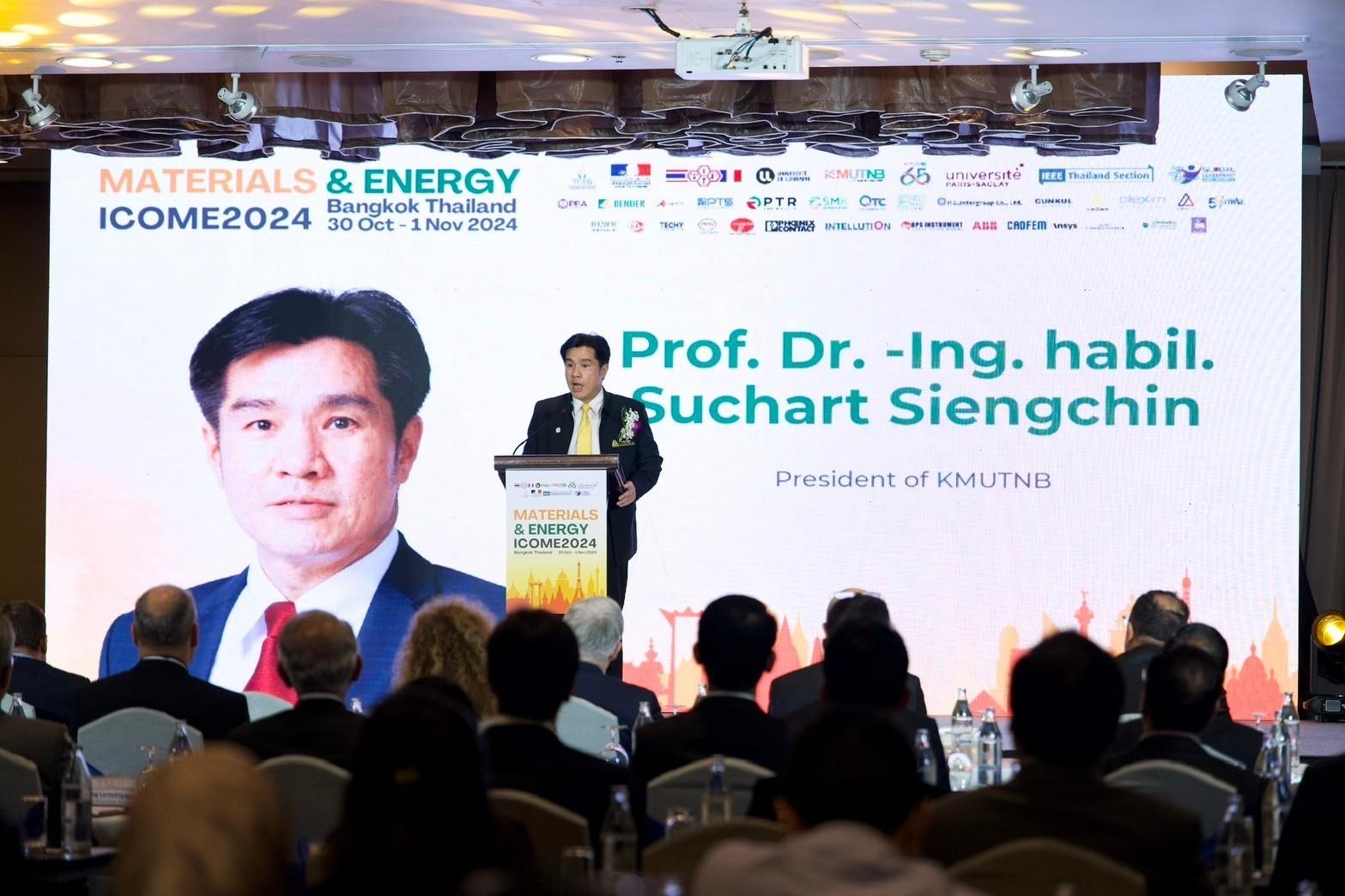 ศ.ดร.สุชาติ เซี่ยงฉิน อธิการบดีมหาวิทยาลัยเทคโนโลยีพระจอมเกล้าพระนครเหนือ กล่าวต้อนรับผู้เข้าร่วมงานประชุมวิชาการ และได้เน้นย้ำถึงความสำคัญของความร่วมมือระดับนานาชาติว่า ”การเฉลิมฉลองครั้งนี้สะท้อนถึงประวัติศาสตร์อันยาวนานและความร่วมมือที่เราสร้างสรรค์มาโดยตลอดหลายปีที่ผ่านมา” นอกจากนี้ ยังกล่าวถึงความสำเร็จจากความร่วมมือระหว่าง ห้องปฏิบัติการ EE-TFRC ของ มจพ. และ ห้องปฏิบัติการ GREEN ของมหาวิทยาลัยลอร์แรน ที่ได้ก่อให้เกิดการแลกเปลี่ยนนักวิจัย การตีพิมพ์ผลงานร่วมกัน และโครงการปริญญาร่วม (Double Degree) ระหว่างมจพ.และมหาวิทยาลัยลอร์แรน และยังได้รับเกียรติอย่างสูงจากเอกอัครราชทูตฝรั่งเศสประจำประเทศไทย ฯพณฯ นาย Jean-Claude Poimbœuf ให้โอวาทและเปิดงานประชุมวิชาการนานาชาติด้านวัสดุและพลังงาน หรือ ICOME2024
