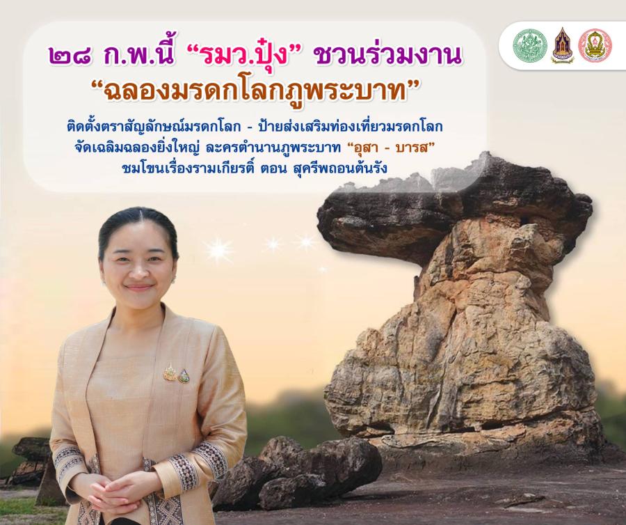 28 ก.พ.นี้ “รมว.สุดาวรรณ” ชวนร่วมงาน “ฉลองมรดกโลกภูพระบาท” ยูเนสโก ส่งมอบหนังสือรับรองขึ้นทะเบียนอย่างเป็นทางการ “กรมศิลป์” ติดตั้งตราสัญลักษณ์มรดกโลก – ป้ายรณรงค์ส่งเสริมท่องเที่ยวมรดกโลก พร้อมจัดงานเฉลิมฉลองยิ่งใหญ่ ละครตำนานภูพระบาท ”อุสา - บารส” โขนเรื่องรามเกียรติ์ ตอน สุครีพถอนต้นรัง ด้าน ศน. เชิญชวนฟังธรรมเทศนา - เจริญจิตภาวนา ณ โบราณสถานหอนางอุสา