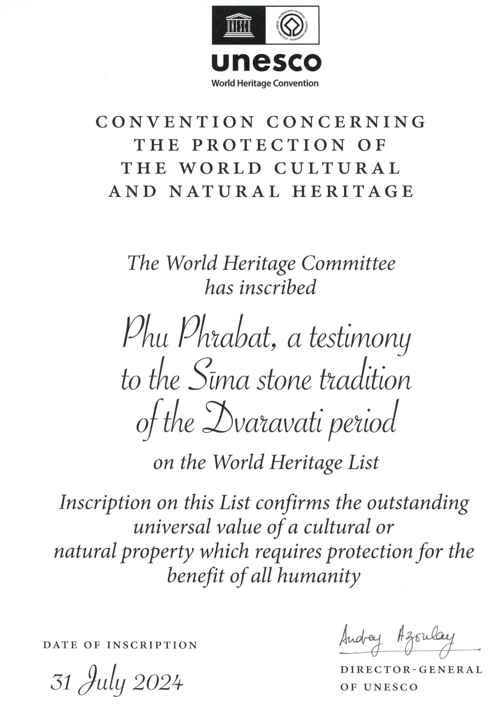 นางสาวสุดาวรรณ หวังศุภกิจโกศล รัฐมนตรีว่าการกระทรวงวัฒนธรรม (รมว.วธ.) เปิดเผยว่า ตามที่องค์การเพื่อการศึกษาวิทยาศาสตร์ และวัฒนธรรมแห่งสหประชาชาติ (ยูเนสโก) ได้ประกาศให้อุทยานประวัติศาสตร์ภูพระบาท จังหวัดอุดรธานี เป็นมรดกโลกทางวัฒนธรรมในชื่อ “ภูพระบาท ประจักษ์พยานแห่งวัฒนธรรมสีมา สมัยทวารวดี” Phu Phrabat a testimony to the Sima stone tradition of the Dvaravati period)” ในการประชุมคณะกรรมการมรดกโลกสมัยสามัญ ครั้งที่ 46 เมื่อเดือนกรกฎาคม 2567 ณ กรุงนิวเดลี สาธารณรัฐอินเดีย โดยเป็นแหล่งมรดกโลกลำดับที่ 8 และแหล่งมรดกโลกทางวัฒนธรรมแห่งที่ 5 ของประเทศไทย อีกทั้งยังเป็นแหล่งมรดกโลกแห่งที่ 2 ของจังหวัดอุดรธานีต่อจากแหล่งโบราณคดีบ้านเชียง ที่ได้รับการขึ้นทะเบียนเป็นมรดกโลกจากยูเนสโก เมื่อพุทธศักราช 2535