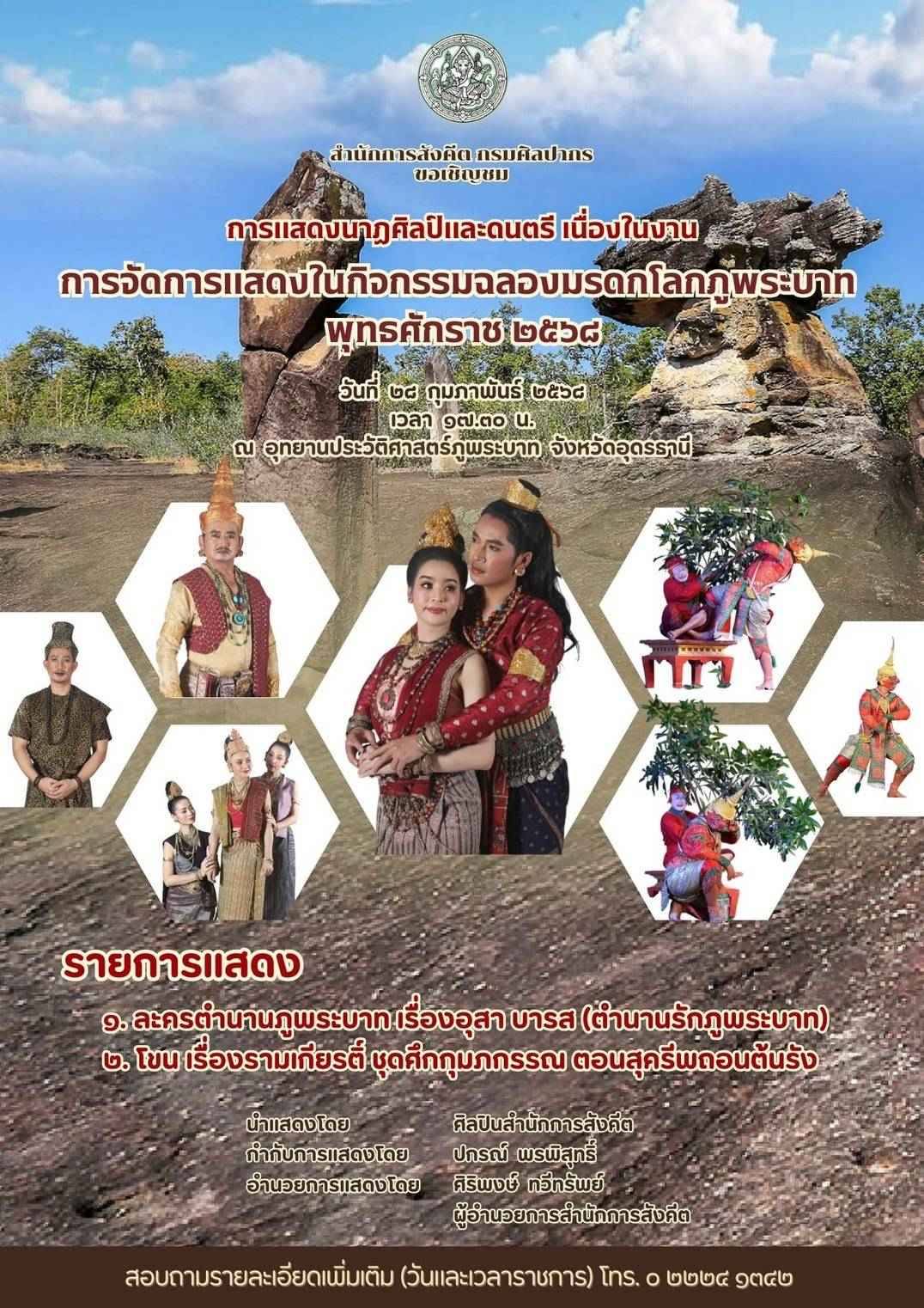 รมว.วธ. กล่าวอีกว่า การแสดงนาฏศิลป์และดนตรี กรมศิลปากร โดยสำนักการสังคีต ได้ฝึกซ้อมจัดเตรียมการแสดงเพื่อดึงดูดนักท่องเที่ยว โดยเฉพาะละครตำนานภูพระบาท เรื่องอุสา บารส (ตำนานรักภูพระบาท) เป็นเรื่องราวโศกนาฏกรรมความรักของนางอุสาและท้าวบารส ซึ่งถูกกีดกันจากเจ้าเมืองพานและถูกกลั่นแกล้งจากเหล่าชายาของท้าวบารสจนนางอุสาป่วยหนักและสิ้นใจ ด้วยความรักที่มีต่อนาง ท้าวบารสจึงตรอมใจตายตามนางอุสาไป จากชื่อตัวละครในนิทาน ตำนานที่บอกเล่าสืบต่อกันมานี้เอง ได้ถูกผูกโยงเข้ากับโบราณสถานบนภูพระบาทจนเกิดเป็นชื่อเรียกโบราณสถานต่าง ๆ เช่นทุกวันนี้