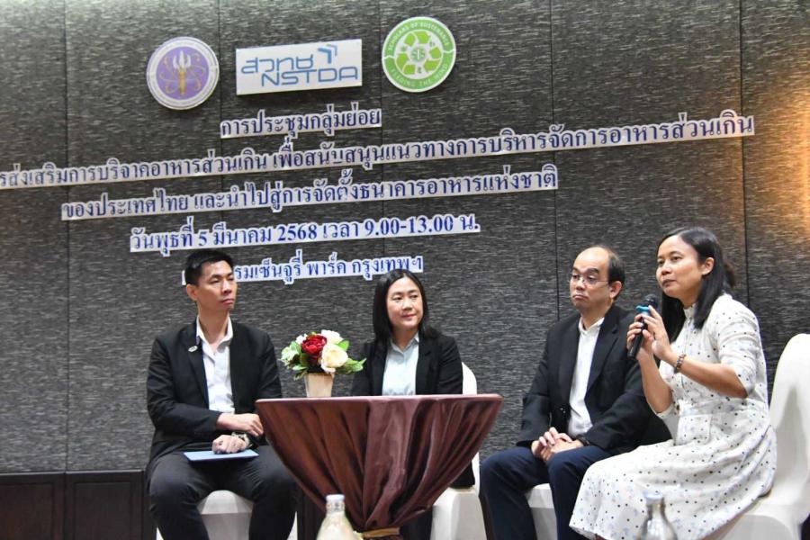 “ประเด็นสำคัญในการประชุมกลุ่มย่อยครั้งนี้ ได้แก่ การกำหนดมาตรการจูงใจ เพื่อส่งเสริมให้ผู้ประกอบการในภาคอุตสาหกรรมอาหาร ธุรกิจร้านอาหาร และที่เกี่ยวข้อง หันมาบริจาคอาหารส่วนเกินอย่างเป็นระบบ รวมถึงเพื่อสร้างความตระหนักรู้ให้สังคมเห็นถึงความสำคัญของการลดปริมาณอาหารส่วนเกิน และการนำอาหารส่วนเกินไปใช้ประโยชน์ โดยการจัดตั้งธนาคารอาหารแห่งชาติ จะถือเป็นกลไกหลักในการบริหารจัดการอาหารส่วนเกินอย่างยั่งยืน และกระจายอาหารไปยังผู้ที่ต้องการ เป็นก้าวสำคัญในการแก้ไขปัญหาความไม่มั่นคงทางอาหารของประเทศไทย ซึ่งเป็นปัญหาที่ส่งผลกระทบต่อประชากรกลุ่มผู้มีรายได้น้อยและกลุ่มเปราะบาง” ดร.ปัทมาพร ประชุมรัตน์ นักวิจัยนโยบาย สวทช. หัวหน้าโครงการการจัดตั้งธนาคารอาหารของประเทศไทย กล่าวปิดท้าย