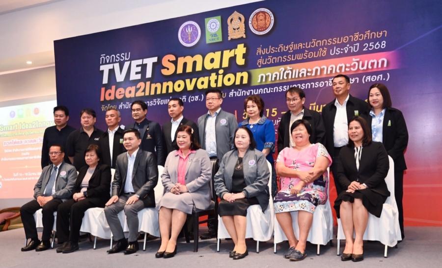 ดร.วิภารัตน์ ดีอ่อง ผู้อำนวยการสำนักงานการวิจัยแห่งชาติ กล่าวว่า วช. ได้ร่วมมือกับ สอศ. จัดกิจกรรม ”TVET Smart Idea2Innovation : สิ่งประดิษฐ์และนวัตกรรมอาชีวศึกษาสู่นวัตกรรมพร้อมใช้” ประจำปี 2568 มีเป้าหมายเพื่อพัฒนาบุคลากรอาชีวศึกษาให้มีทักษะและสมรรถนะด้านการประดิษฐ์และนวัตกรรมที่ตอบโจทย์ความต้องการทางเศรษฐิจและสังคม กิจกรรมนี้มุ่งเน้นการส่งเสริมทักษะการวิจัย การคิดเชิงสร้างสรรค์ และการแก้ปัญหา โดยมีกลไกสนับสนุน อาทิ การอบรม การประกวดผลงาน และการสร้างเครือข่ายความร่วมมือกับภาคอุตสาหกรรม พร้อมมีตัวอย่างผลงานที่ได้รับทุนสนับสนุน อาทิ เครื่องผสมเกสรดอกทุเรียน เรือไฟฟ้าเก็บขยะ แสดงให้เห็นถึงศักยภาพของนักประดิษฐ์อาชีวศึกษาในการพัฒนานวัตกรรมที่สามารถนำไปใช้ประโยชน์ในเชิงพาณิชย์และชุมชน ทั้งยังส่งเสริมการพัฒนาหลักสูตรและการเรียนการสอนที่สอดคล้องกับความต้องการของตลาดแรงงาน โดยเน้นการเรียนรู้ผ่านโครงงานและการปฏิบัติจริง เพื่อพัฒนาทักษะที่สอดคล้องกับทิศทางในศตวรรษที่ 21 อาทิ ทักษะการคิดวิเคราะห์ การสื่อสาร และการทำงานร่วมกัน