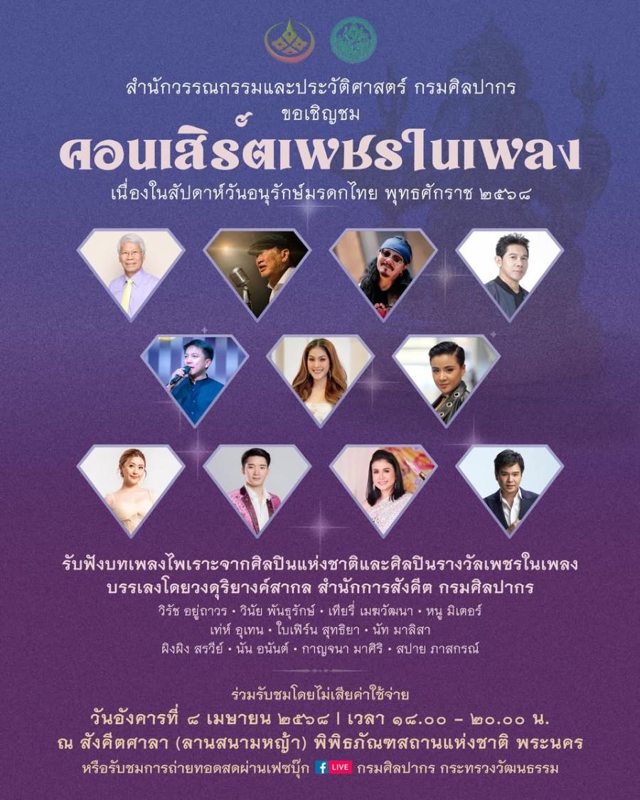 กรมศิลปากร โดยสำนักวรรณกรรมและประวัติศาสตร์ ขอเชิญชมการแสดง “คอนเสิร์ตเพชรในเพลง” ในงานสัปดาห์วันอนุรักษ์มรดกไทย พุทธศักราช ๒๕๖๘ รับฟังบทเพลงไพเราะ จากศิลปินแห่งชาติ และศิลปินรางวัล ”เพชรในเพลง” ในวันอังคารที่ ๘ เมษายน ๒๕๖๘ เวลา ๑๘.๐๐น. - ๒๐.๐๐ น. ณ เวทีกลางแจ้ง พิพิธภัณฑสถานแห่งชาติ พระนคร ชมฟรี