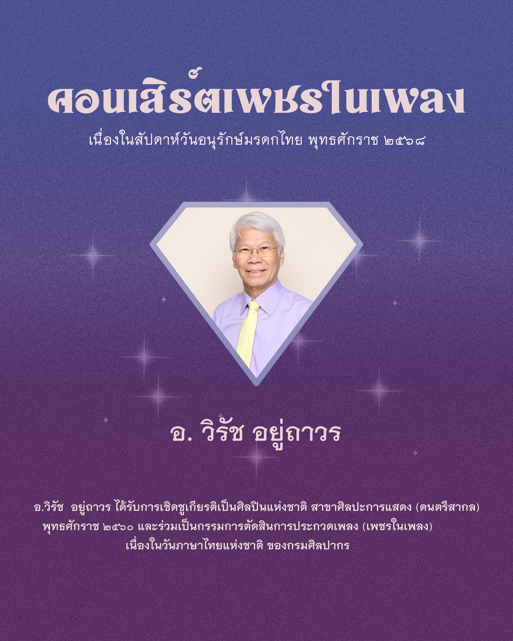 นายพนมบุคร จันทรโชติ อธิบดีกรมศิลปากร กล่าวว่า กรมศิลปากรได้จัดงานสัปดาห์วันอนุรักษ์มรดกไทย พุทธศักราช ๒๕๖๘ ให้ประชาชนเข้าร่วมงานโดยไม่เสียค่าใช้จ่าย เพื่อเปิดโอกาสให้ประชาชนเข้าถึงและมีส่วนร่วมในการรักษามรดกทางวัฒนธรรมอันเป็นเอกลักษณ์ของชาติ โดยในวันอังคารที่ ๘ เมษายน ๒๕๖๘ สำนักวรรณกรรมและประวัติศาสตร์ ได้เชิญศิลปินซึ่งล้วนเป็นผู้ใช้ภาษาไทย อันเป็นมรดกวัฒนธรรมที่สำคัญยิ่งของชาติได้อย่างยอดเยี่ยม มาร่วมขับร้องบทเพลงอันไพเราะ โดยมีศิลปินแห่งชาติ ได้แก่ อาจารย์วิรัช อยู่ถาวร ศิลปินแห่งชาติ สาขาศิลปะการแสดง (ดนตรีสากล) พุทธศักราช ๒๕๖๐ อาจารย์วินัย พันธุรักษ์ ศิลปินแห่งชาติ สาขาศิลปะการแสดง (ขับร้อง - เพลงไทยสากล) พุทธศักราช ๒๕๖๒ และศิลปินรางวัล ”เพชรในเพลง” อาทิ หนู มิเตอร์ เทียรี่ เมฆวัฒนา เท่ห์ อุเทน พรหมมินทร์ ใบเฟิร์น สุทธิยา ผิง ผิง สรวีย์ กาญจนา มาศิริ นัท มาลิสา นัน อนันต์ อาศัยไพรพนา บรรเลงดนตรี โดยวงดุริยางค์สากล สำนักการสังคีต กรมศิลปากร