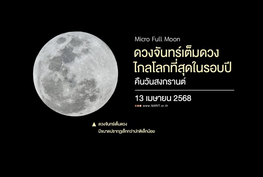 สถาบันวิจัยดาราศาสตร์แห่งชาติ (องค์การมหาชน) (สดร. หรือ NARIT) กระทรวงการอุดมศึกษา วิทยาศาสตร์ วิจัย และนวัตกรรม (อว.) เผยว่า คืนวันที่ 13 เมษายน 2568 ดวงจันทร์เต็มดวงไกลโลกที่สุดในรอบปี หรือ “ไมโครฟูลมูน” ในคืนวันสงกรานต์ไทย จะเห็นดวงจันทร์เต็มดวงมีขนาดปรากฏเล็กกว่าปกติเล็กน้อย