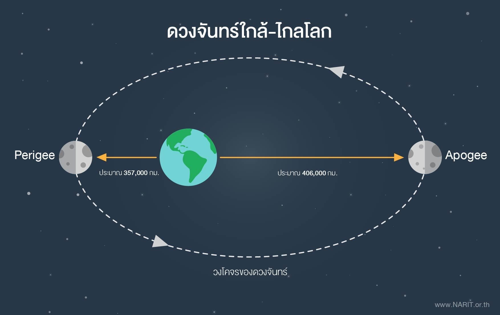 ดวงจันทร์โคจรรอบโลกเป็นวงรี 1 รอบ ใช้เวลาประมาณ 27.3 วัน ในแต่ละเดือนจะมีทั้งวันที่ดวงจันทร์ใกล้โลกและไกลโลก ตำแหน่งที่ดวงจันทร์ใกล้โลกที่สุด เรียกว่า เปริจี (Perigee) มีระยะห่างเฉลี่ยประมาณ 357000 กิโลเมตร และตำแหน่งที่ดวงจันทร์ไกลโลกที่สุด เรียกว่า อะโปจี (Apogee) มีระยะห่างเฉลี่ยประมาณ 406000 กิโลเมตร การที่ผู้คนบนโลกมองเห็นดวงจันทร์เต็มดวงในคืนที่ดวงจันทร์โคจรเข้ามาใกล้หรือไกลโลกมีขนาดที่แตกต่างกัน นับเป็นเหตุการณ์ปกติที่สามารถอธิบายได้ตามหลักการทางวิทยาศาสตร์