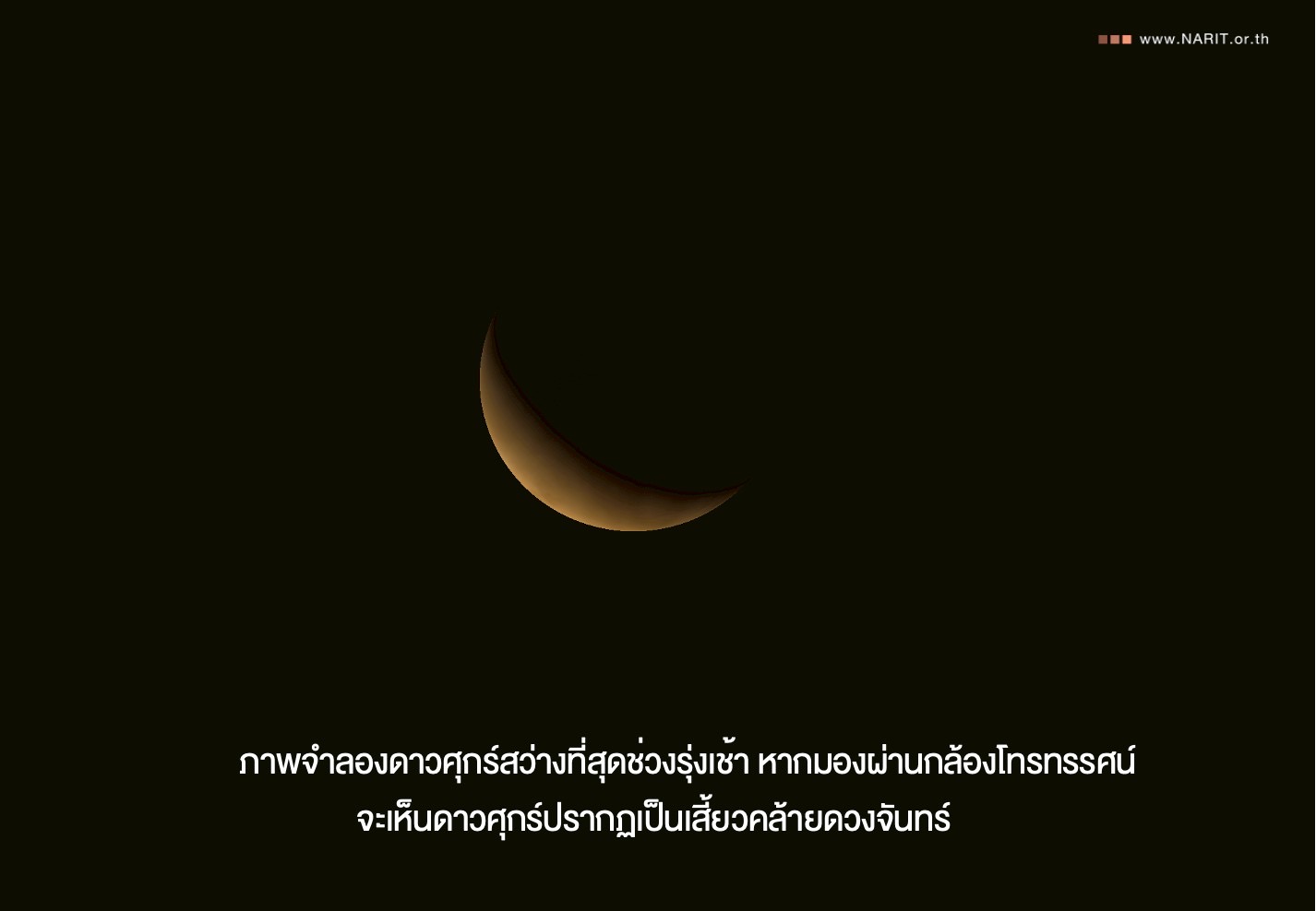 นายศุภฤกษ์ คฤหานนท์ ผู้จัดการศูนย์บริการวิชาการและสื่อสารทางดาราศาสตร์ เปิดเผยว่า ในวันที่ 24 เมษายน 2568 “ดาวศุกร์” จะปรากฏสว่างที่สุดเป็นครั้งสุดท้ายในรอบปีนี้ เห็นชัดด้วยตาเปล่าทางทิศตะวันออก ตั้งแต่เวลาประมาณ 04:00 น. เป็นต้นไป จนกระทั่งดวงอาทิตย์ขึ้นจากขอบฟ้า หากดูผ่านกล้องโทรทรรศน์จะเห็นดาวศุกร์ปรากฏเป็นเสี้ยวคล้ายดวงจันทร์ นอกจากนี้ ในช่วงเวลาดังกล่าวยังสามารถสังเกตเห็นดาวเสาร์ปรากฏถัดลงมาใกล้ขอบฟ้า อีกทั้งยังมีดวงจันทร์เสี้ยวปรากฏสว่างถัดขึ้นไปอีกด้วย หากทัศนวิสัยท้องฟ้าดีสามารถชมความสวยงามของดาวศุกร์และวัตถุท้องฟ้าต่าง ๆ ได้ด้วยตาเปล่าอย่างชัดเจน