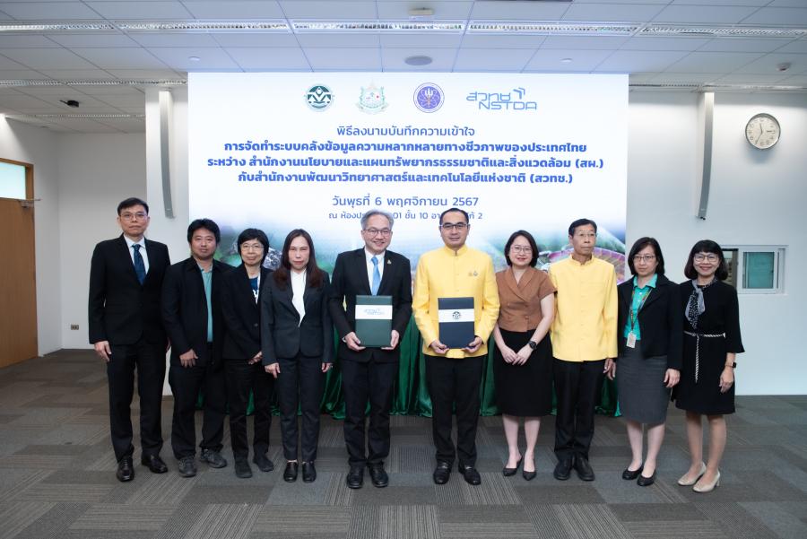 เมื่อวันที่ 6 พฤศจิกายน 2567: สำนักงานนโยบายและแผนทรัพยากรธรรมชาติและสิ่งแวดล้อม (สผ.) โดยกองจัดการความหลากหลายทางชีวภาพ จัดพิธีลงนามบันทึกความเข้าใจการจัดทำระบบคลังข้อมูลความหลากหลายทางชีวภาพของประเทศไทย โดยมีนายประเสริฐ ศิรินภาพร เลขาธิการ สผ. และ ศาสตราจารย์ ดร.ชูกิจ ลิมปิจำนงค์ ผู้อำนวยการสำนักงานพัฒนาวิทยาศาสตร์และเทคโนโลยีแห่งชาติ (สวทช.) เป็นประธานการลงนามความร่วมมือ โดยมีวัตถุประสงค์เพื่อเสริมสร้างความร่วมมือในการรวบรวม จัดเก็บ และวิเคราะห์ข้อมูลความหลากหลายทางชีวภาพของประเทศ โดยมีเจ้าหน้าที่ของ สผ. และ สวทช. เข้าร่วมเป็นสักขีพยานในพิธีลงนาม จำนวน 70 คน ณ ห้องประชุม 1001 ชั้น 10 อาคารทิปโก้ 2 ถนนพระรามที่ 6 กรุงเทพฯ