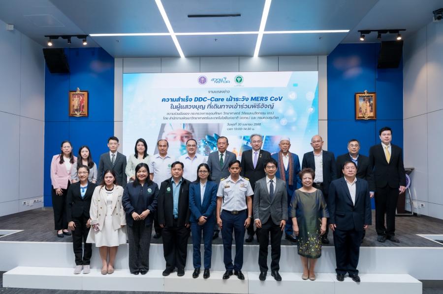 (30 เมษายน 2568) ที่ห้องแถลงข่าวชั้น 1 กระทรวง อว. อาคารพระจอมเกล้า: นายศุภชัย ใจสมุทร ผู้ช่วยรัฐมนตรีประจำกระทรวงการอุดมศึกษา วิทยาศาสตร์ วิจัยและนวัตกรรม (อว.) เป็นประธานแถลงข่าว ความสำเร็จ DDC-Care เฝ้าระวังโรคเมอร์ส (MERS-CoV) ในผู้แสวงบุญที่เดินทางเข้าร่วมพิธีฮัจญ์ จากความร่วมมือของกระทรวงการอุดมศึกษา วิทยาศาสตร์ วิจัยและนวัตกรรม (อว.) โดย สำนักงานพัฒนาวิทยาศาสตร์และเทคโนโลยีแห่งชาติ (สวทช.) และกรมควบคุมโรค กระทรวงสาธารณสุข เพื่อดำเนินมาตรการเฝ้าระวังโรคทางเดินหายใจตะวันออกกลาง หรือโรคเมอร์ส MERS-CoV อย่างเข้มงวด ด้วย DDC-Care Platform เทคโนโลยีรับมือโรคระบาดข้ามพรมแดน ซึ่งถือเป็นการทำงานเชิงรุกและการเฝ้าระวังโรคตามมาตรการสาธารณสุข สำหรับผู้แสวงบุญชาวไทยที่เดินทางเข้าร่วมพิธีฮัจญ์ โดยมี ศาสตราจารย์ ดร.ชูกิจ ลิมปิจำนงค์ ผู้อำนวยการ สวทช. นายแพทย์ดิเรก ขำแป้น รองอธิบดีกรมควบคุมโรค กระทรวงสาธารณสุข นายประสิทธิ์ มะหะหมัด เลขานุการจุฬาราชมนตรี ทีมนักวิจัยและเจ้าหน้าที่ของหน่วยงานที่เกี่ยวข้องเข้าร่วม