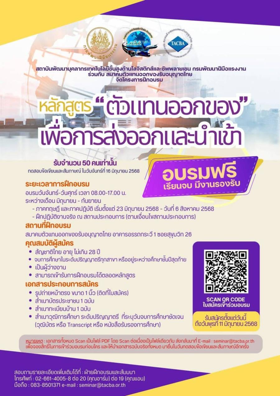 นายเดชา กล่าวต่อว่า การรับสมัครฝึกอบรมหลักสูตรตัวแทนออกของเพื่อการส่งออกและนำเข้า เป็นหลักสูตรระยะยาว (240 ชั่วโมง) มีทั้งภาคทฤษฎีและภาคปฏิบัติ ฝึกอบรมตั้งแต่ วันจันทร์ – ศุกร์ เวลา 08.00 – 17.00 น. โดยภาคทฤษฎี ฝึกระหว่างเดือนมิถุนายน - สิงหาคม 2568 และภาคปฏิบัติ (ฝึกงานในสถานประกอบการ) ฝึกระหว่างเดือนสิงหาคม - กันยายน 2568 ผู้เข้าฝึกอบรมจะได้ความรู้เกี่ยวกับการปฏิบัติงานด้านตัวแทนออกของเพื่อการส่งออกและนำเข้า ด้านโลจิสติกส์ภายในคลังสินค้า อาทิ การบริหารจัดการต้นทุนการขนส่งระหว่างประเทศและในประเทศ กฎหมายศุลกากรที่เกี่ยวข้องกับการนำเข้าและส่งออก เทคนิคการนำเข้าและส่งออกทางระบบอิเล็กทรอนิกส์ (e-Logistics) ผู้สมัครจะต้องเป็นผู้ที่กำลังว่างงาน สัญชาติไทย อายุไม่เกิน 28 ปี จบการศึกษาในระดับปริญญาตรี ทุกสาขา และต้องไม่อยู่ในระหว่างอบรมหรือศึกษาต่อ ที่น่ายินดีไปกว่านั้น หลังจากจบการฝึกอบรมจะมีบริษัทภายใต้สมาคมตัวแทนออกรับอนุญาตไทย อาทิ บริษัท โลจิสติกส์ แมเนจเม้นท์ เซอร์วิสเซส จำกัด บริษัท ทรู โลติสติกส์ จำกัด บริษัท แอพโซลูท มัลติโมดัล จำกัด บริษัท ซีทีไอ โลจิสติกส์ จำกัด บริษัท ซีเอฟเอฟ จำกัด บริษัท ทีม โกลบอล จำกัด บริษัท บิส โอเชี่ยน โลจิสติกส์ จำกัด รับเข้าทำงานทันที โดยมีรายได้เริ่มต้น ตั้งแต่ 18000 ถึง 40000 บาท จึงถือเป็นโอกาสที่ดีสำหรับผู้ที่สนใจงานด้านโลจิสติกส์เป็นอย่างมาก