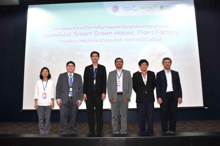 ปทุมธานี 20 พฤษภาคม 2568 - สำนักงานพัฒนาวิทยาศาสตร์และเทคโนโลยีแห่งชาติ (สวทช.) โดยโปรแกรมสนับสนุนการพัฒนาเทคโนโลยีและนวัตกรรม (ITAP) ร่วมกับ ศูนย์พันธุวิศวกรรมและเทคโนโลยีชีวภาพแห่งชาติ (BIOTEC) และอุทยานวิทยาศาสตร์ประเทศไทย (อวท.) จัดสัมมนา “โอกาสและความท้ายในการยกระดับอุตสาหกรรมเกษตร ด้วยเทคโนโลยี Smart Green House Plant Factory การพัฒนาพันธุ์พืชผักสมุนไพร และการใช้ชีวภัณฑ์” เพื่อนำเสนอองค์ความรู้และผลงานวิจัยของ สวทช. ไปสู่การประยุกต์ใช้จริงในภาคอุตสาหกรรมเกษตร ประกอบด้วย เทคโนโลยี Smart Green House (โรงเรือนอัจฉริยะ) Plant Factory (โรงงานผลิตพืช) การพัฒนาพันธุ์พืชผักสมุนไพร และการใช้ชีวภัณฑ์ ซึ่งล้วนเป็นเครื่องมือสำคัญที่จะช่วยเพิ่มประสิทธิภาพ ลดต้นทุน และสร้างมูลค่าเพิ่มให้กับผลผลิตทางการเกษตร เพื่อให้ผู้ประกอบการอุตสาหกรรมเกษตรได้นำเทคโนโลยีและนวัตกรรมไปต่อยอดและประยุกต์ใช้ในการพัฒนาธุรกิจเกษตรปลอดภัยให้เติบโตอย่างยั่งยืนและมีประสิทธิภาพยิ่งขึ้น