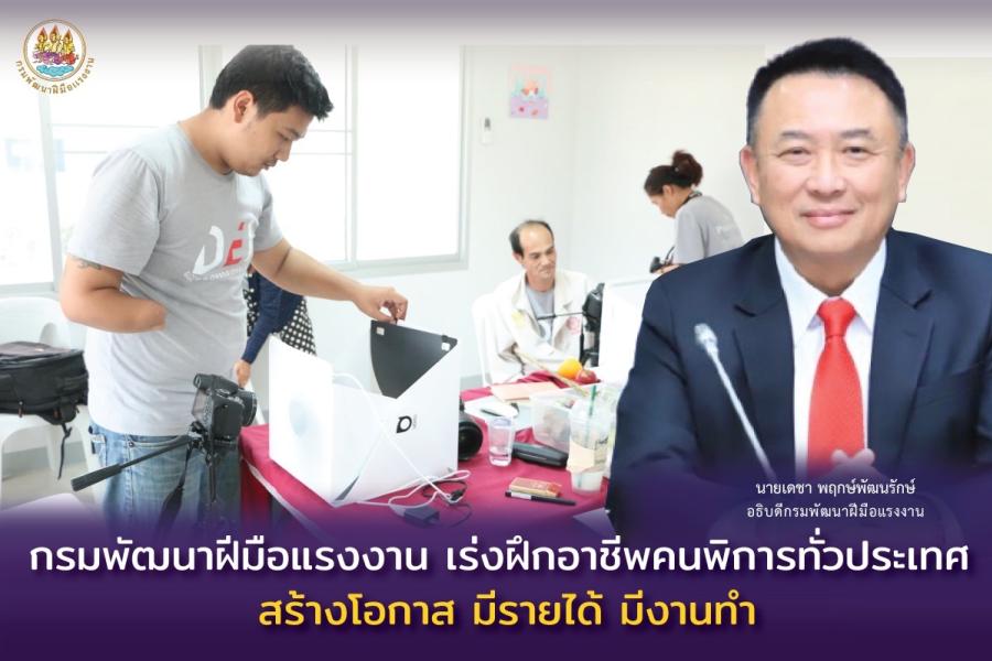 นายเดชา พฤกษ์พัฒนรักษ์ อธิบดีกรมพัฒนาฝีมือแรงงาน เปิดเผยว่า หลังจากที่กรมพัฒนาฝีมือแรงงาน กระทรวงแรงงาน ได้ลงนามบันทึกข้อตกลงร่วมกับกรมส่งเสริมและพัฒนาคุณภาพชีวิตคนพิการ กระทรวงการพัฒนาสังคมและความมั่นคงของมนุษย์ และเครือข่ายพัฒนาฝีมือแรงงาน 12 หน่วยงาน ในการส่งเสริมและพัฒนาทักษะอาชีพคนพิการและผู้ดูแลคนพิการสู่ความยั่งยืน เพื่อพัฒนาศักยภาพคนพิการ และผู้ดูแลคนพิการให้มีความรู้ ความสามารถ โดยฝึกอบรม ให้มีทักษะฝีมือ สามารถประกอบอาชีพได้ตามความถนัด และตรงกับความต้องการของนายจ้าง ผู้ประกอบการ มีรายได้เลี้ยงตนเองและครอบครัว และเป็นการส่งเสริมคุณภาพชีวิตให้ดีขึ้นไปเมื่อต้นเดือนพฤษภาคม โดยมีเป้าหมายพัฒนาทักษะคนพิการจำนวน 4328 คน จำนวน 215 รุ่น ใน 5 กลุ่มสาขาอาชีพ ได้แก่ 1. สาขาอาชีพเครื่องดื่ม อาหาร อาหารว่าง 2. สาขาอาชีพเทคโนโลยีและช่างฝีมือ 3. สาขาอาชีพศิลปะประดิษฐ์ จักสาน และของที่ระลึก 4. สาขาอาชีพเกษตรและอาหารแปรรูป 5. สาขาอาชีพขายสินค้าและบริการ ปัจจุบันกรมพัฒนาฝีมือแรงงาน ดำเนินการฝึกอบรมให้กับคนพิการและผู้ดูแลคนพิการแล้วกว่า 20 จังหวัด เปิดฝึกอบรมในหลากหลายหลักสูตร อาทิ หลักสูตรการทำเบเกอรี่ การติดตั้งและประยุกต์ใช้โซล่าเซลล์ การซ่อมรถเข็นคนพิการ การทำลูกประคบสมุนไพรสำหรับคนพิการทางการมองเห็น การทำของที่ระลึกจากผ้าพื้นเมือง การขายสินค้าออนไลน์ การปลูกพืชโดยไม่ใช้ดิน (ไฮโดรโพนิคส์) การพิมพ์ลายผ้าด้วยใบไม้ การทำขนมไทย พนักงานทำความสะอาดส่วนกลาง การถักสานผลิตภัณฑ์จากเส้นพลาสติก การใช้สมาร์ทโฟนเพื่อธุรกิจออนไลน์ การแปรรูปผลิตภัณฑ์จากวัสดุธรรมชาติเพื่อเพิ่มมูลค่า การแปรรูปผลิตภัณฑ์ทางการเกษตรและการตลาดออนไลน์