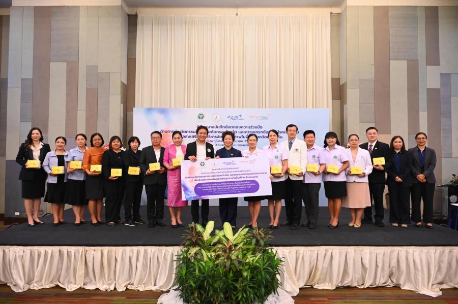 5 มิถุนายน 2568 ณ โรงแรมพูลแมน ขอนแก่น - กระทรวงการอุดมศึกษา วิทยาศาสตร์ วิจัยและนวัตกรรม (อว.) สำนักงานพัฒนาวิทยาศาสตร์และเทคโนโลยีแห่งชาติ (สวทช.) โดย ศูนย์นาโนเทคโนโลยีแห่งชาติ (นาโนเทค) ร่วมกับสำนักงานสาธารณสุขจังหวัดขอนแก่น และองค์การบริหารส่วนจังหวัดขอนแก่น ลงนามความร่วมมือด้าน “การนำนวัตกรรมชุดตรวจคัดกรองโรคไต และภาวะแทรกซ้อนจากโรคเบาหวาน เพื่อส่งเสริมการบริหารจัดการสุขภาพในพื้นที่จังหวัดขอนแก่น” โดยมีเป้าหมายเพื่อจัดกิจกรรมอบรมการใช้ชุดตรวจคัดกรองโรคไตให้แก่บุคลากรทางการแพทย์และเจ้าหน้าที่โรงพยาบาลส่งเสริมสุขภาพตำบล ครอบคลุมทั้ง 248 แห่งในจังหวัดขอนแก่น เพื่อขับเคลื่อนการใช้ชุดตรวจคัดกรองอย่างครอบคลุมทั่วทั้งจังหวัด เป็นการนำร่อง ’ขอนแก่นโมเดล’ ซึ่งตั้งเป้าขยายผลสู่ระดับประเทศภายในปี 2571 เพื่อยกระดับสุขภาวะของประชาชนไทยด้วยนวัตกรรมทางการแพทย์ที่ทันสมัย เข้าถึงง่าย และตอบโจทย์ความต้องการในพื้นที่