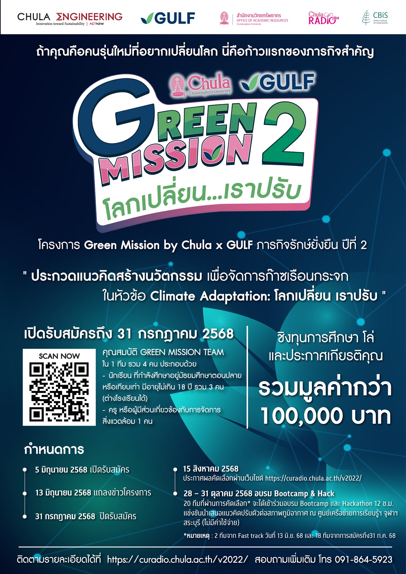 บริษัท กัลฟ์ ดีเวลลอปเมนท์ จำกัด (มหาชน) (กัลฟ์) ร่วมกับ คณะวิศว กรรมศาสตร์ จุฬาลงกรณ์มหาวิทยาลัย และสถานีวิทยุแห่งจุฬาลงกรณ์มหาวิทยาลัย (สถานีวิทยุแห่งจุฬาฯ) ภายใต้กำกับดูแลของ สำนักงานวิทยทรัพยากร จุฬาลงกรณ์มหาวิทยาลัย เดินหน้าสานต่อโครงการ Green Mission by Chula x GULF ภารกิจรักษ์ยั่งยืน ปีที่ 2 ภายใต้แนวคิด “Climate Change Adaptation: โลกเปลี่ยน เราปรับ” เพื่อเชิญชวนนักเรียนมัธยมปลายจากทั่วประเทศ ร่วมระดมความคิดสร้างสรรค์นวัตกรรมเพื่อรับมือกับการเปลี่ยนแปลงสภาพภูมิอากาศ มุ่งเน้นการสร้างแรงบันดาลใจและเปิดโอกาสให้นักเรียนได้แสดงศักยภาพในการเป็นนักคิดและนักสร้างสรรค์ รับสมัครตั้งแต่วันนี้จนถึง 31 กรกฎาคม 2568