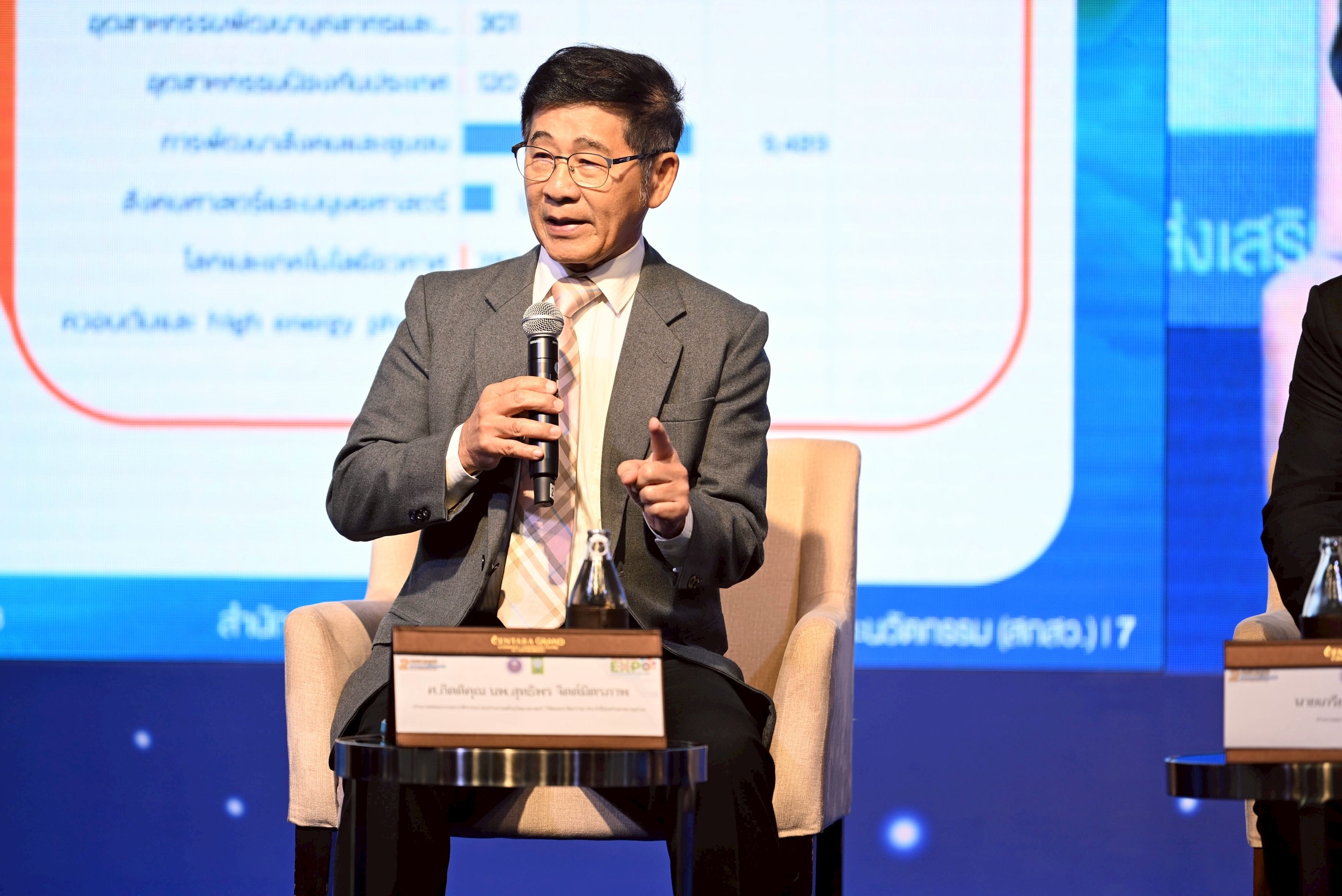 ต่อจากนั้น จึงเป็นการจัดเสวนาในหัวข้อ “ดัชนีชี้วัดขีดความสามารถในการแข่งขันของประเทศ: สมรรถนะกำลังคนวิจัยและนวัตกรรมอุตสาหกรรมเป้าหมาย” โดยมีผู้นำด้านวิทยาศาสตร์และอุตสาหกรรมระดับแนวหน้าเข้าร่วม ประกอบด้วย ศ.กิตติคุณ นพ.สุทธิพร จิตต์มิตรภาพ ประธานคณะกรรมการพิจารณางบประมาณด้านวิทยาศาสตร์ วิจัยและนวัตกรรม ประจำปีงบประมาณ 2569 นายเกรียงไกร เธียรนุกุล ประธานสภาอุตสาหกรรมแห่งประเทศไทย ศ.ดร.สมปอง คล้ายหนองสรวง ผู้อำนวยการสำนักงานคณะกรรมการส่งเสริมวิทยาศาสตร์ วิจัยและนวัตกรรม และ ผศ.ดร.วีรชัย อาจหาญ ผู้ว่าการสถาบันวิจัยวิทยาศาสตร์และเทคโนโลยีแห่งประเทศไทย (วว.) ร่วมปลุกพลังความคิด แลกเปลี่ยนวิสัยทัศน์ และชี้ทางสู่การยกระดับขีดความสามารถของประเทศ ผ่านนวัตกรรมที่ตอบโจทย์อนาคต