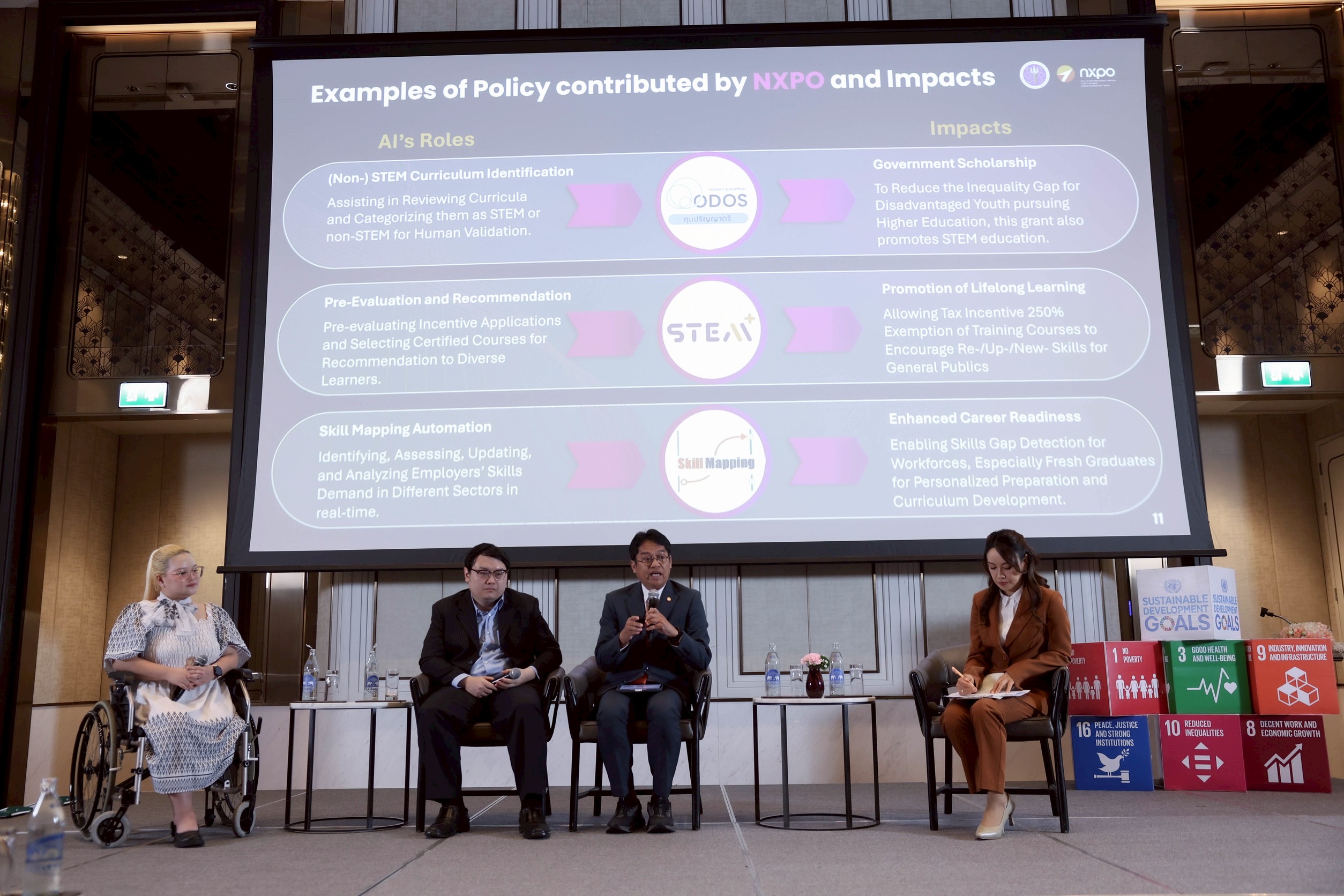 รองผู้อำนวยการ สอวช. กล่าวเพิ่มเติมว่า สอวช. ยังได้ร่วมพัฒนาเชิงนโยบายโดยใช้ AI เพื่อจัดกลุ่มหลักสูตร เช่น STEM และ Non-STEM ในการให้ทุนการศึกษา รวมทั้งประเมินและแนะนำหลักสูตรคุณภาพเพื่อส่งเสริมการเรียนรู้ตลอดชีวิต พร้อมทั้งพัฒนาระบบจับคู่ทักษะที่เชื่อมโยงช่องว่างด้านทักษะกับความต้องการของนายจ้างแบบเรียลไทม์ผ่านแพลตฟอร์ม STEMPlus