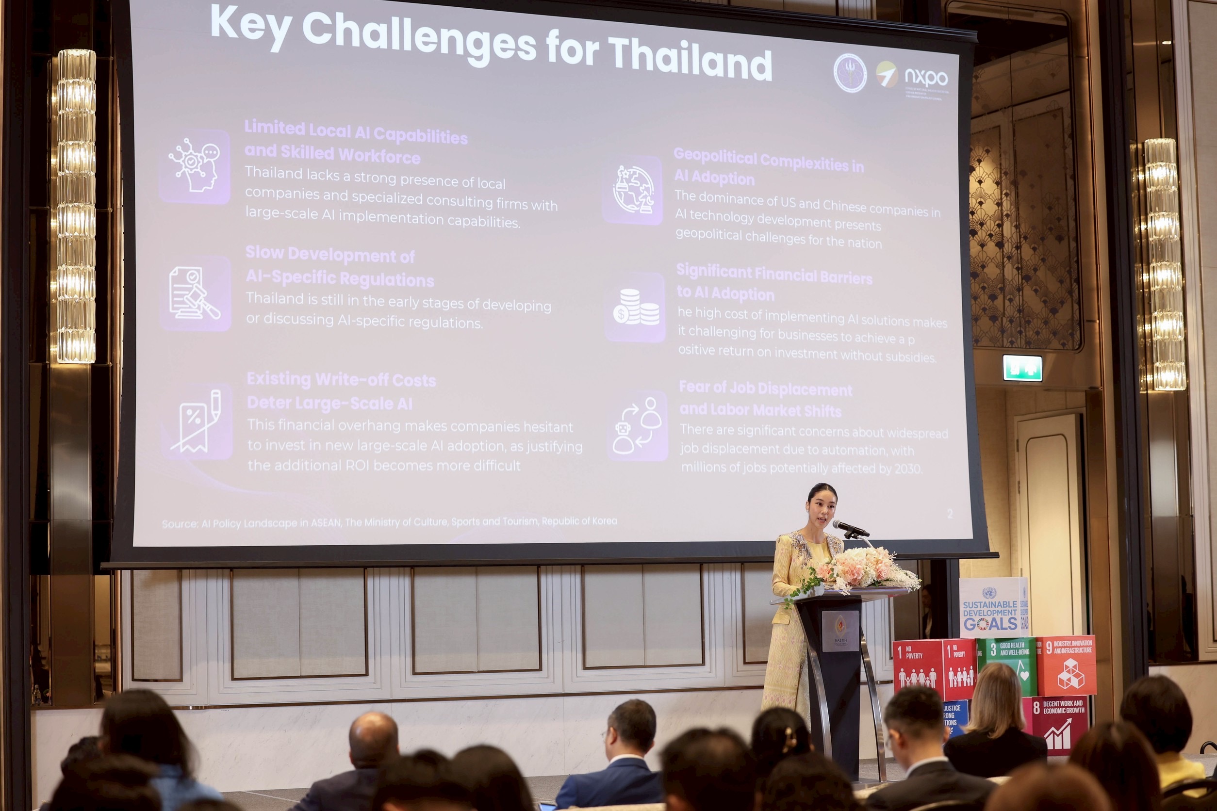 นางสาวสุชาดา กล่าวถึง “ระบบการศึกษาในยุค AI ของไทย” ว่า ประเทศไทยกำลังเผชิญความท้าทายหลายด้านในการเข้าสู่ AI โดยเฉพาะปัญหาการขาดแคลนบุคลากรท้องถิ่นที่มีทักษะด้าน AI การพัฒนากฎระเบียบที่ล่าช้า ต้นทุนในการนำ AI ขนาดใหญ่มาใช้ที่ยังไม่คุ้มค่า รวมถึงบริบททางภูมิรัฐศาสตร์ที่การครองเทคโนโลยีเป็นของสหรัฐอเมริกาและจีน ขณะเดียวกันยังมีความกังวลเรื่องการสูญเสียงานจากระบบอัตโนมัติ โดยข้อมูลระบุว่าในช่วงปี 2025–2030 กลุ่มอาชีพที่เติบโตเร็วที่สุด ได้แก่ นักวิเคราะห์ข้อมูลขนาดใหญ่ วิศวกร AI และวิศวกรการเรียนรู้ของเครื่องจักร นักพัฒนาซอฟต์แวร์และแอปพลิเคชัน นักวิเคราะห์ความปลอดภัยทางไซเบอร์ และวิศวกรด้านพลังงานหมุนเวียน ส่วนอาชีพที่มีแนวโน้มลดลงอย่างรวดเร็ว ได้แก่ พนักงานธนาคาร พนักงานบัญชี คอลเซ็นเตอร์ แคชเชียร์ และพนักงานบริการหน้าร้าน